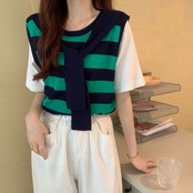 レイヤード風 サマーニット レディース クルーネック ニットカットソー 普段着 着やせ トップス お洒落 韓国