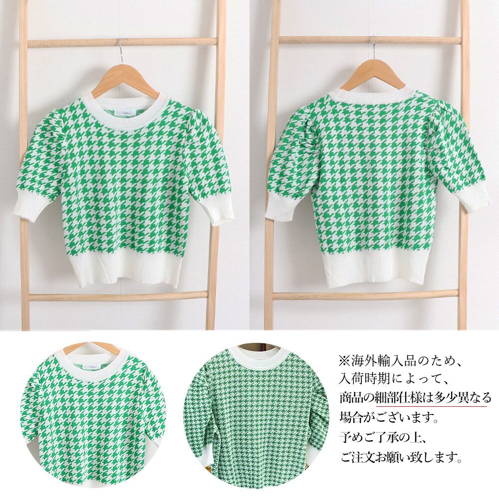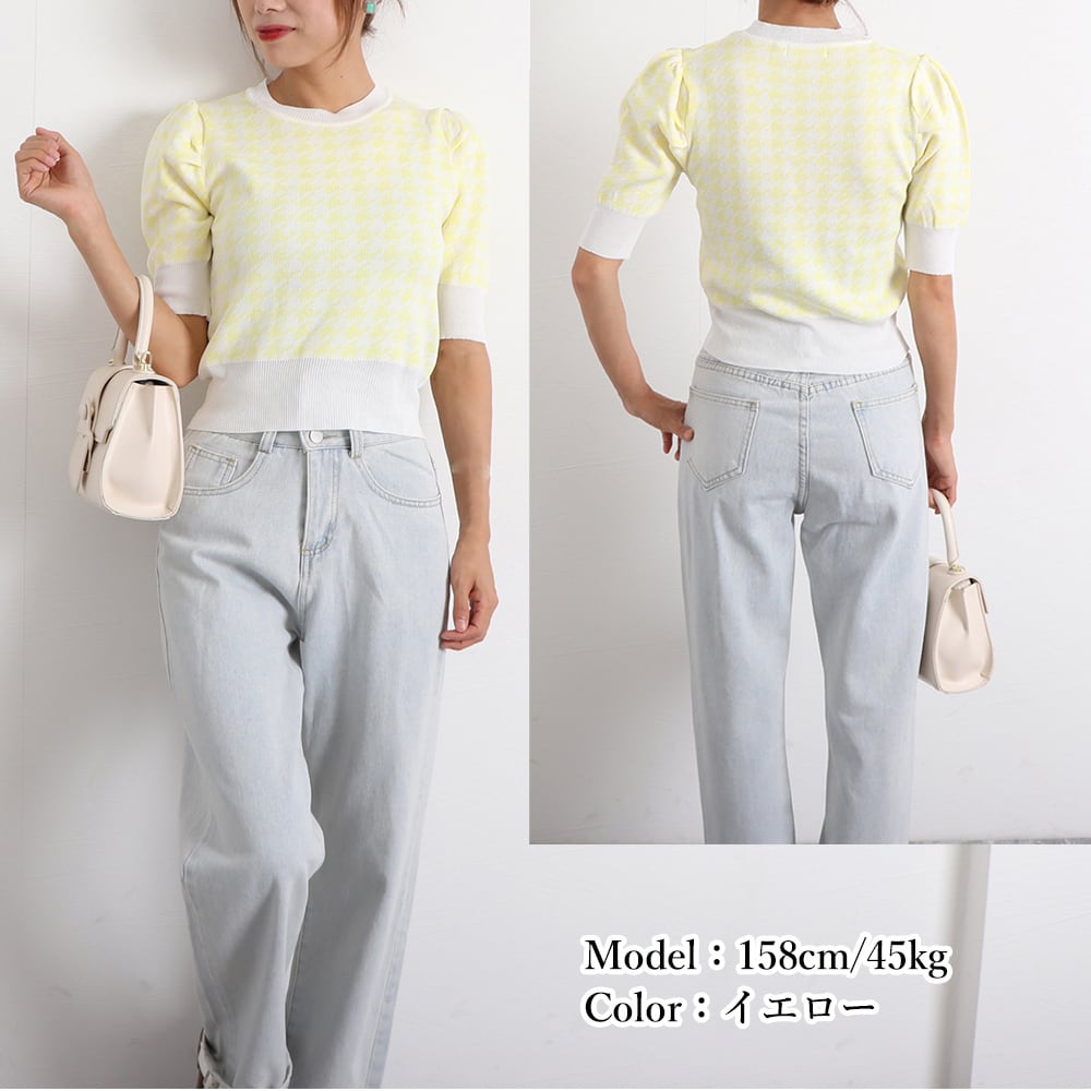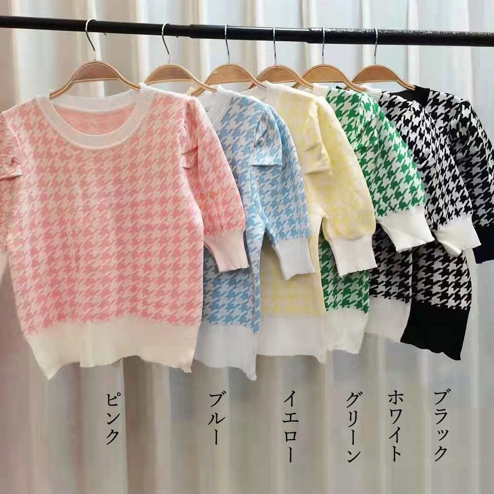 パフスリーブ ラウンドネック ニットトップス 千鳥格子柄 韓国プルオーバー カジュアル	 五分袖ニットソー レトロ春秋夏