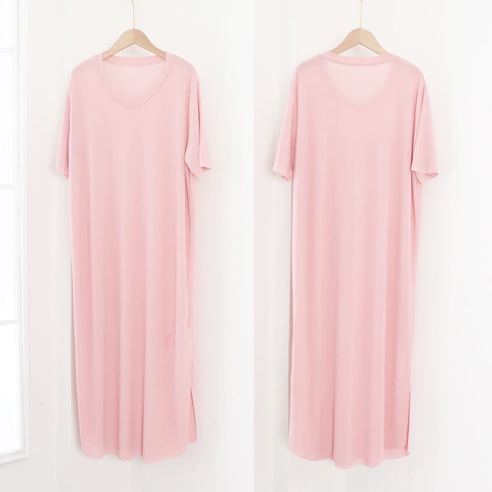 半袖ルームウェア 体型カバー レディース 夏パジャマ 薄手tシャツワンピ 快適部屋着 細めリブ スリット入り 肌触りいい