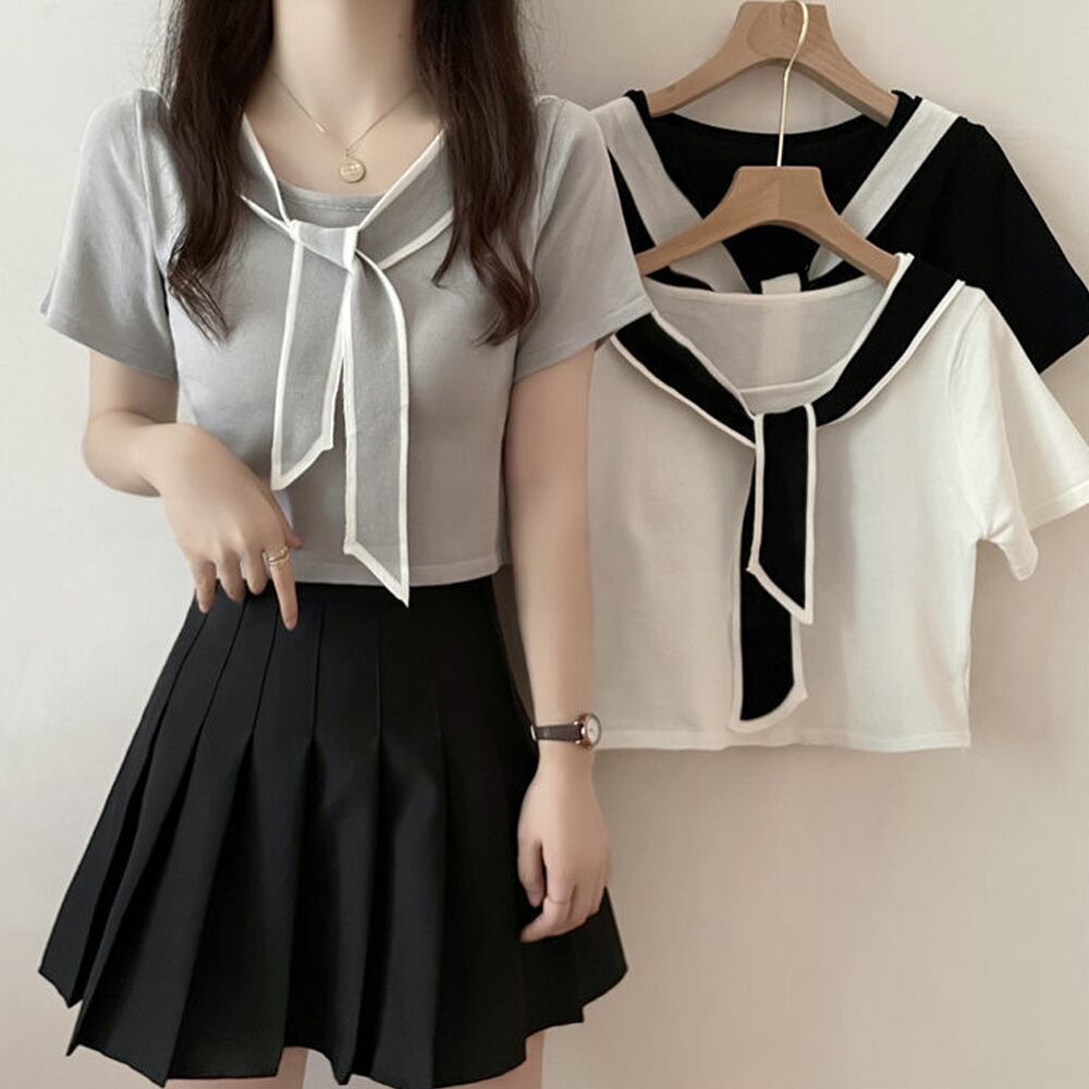 レディース 韓国風サマーニット シンプル 半袖 ショート丈 ニットカットソー 無地 お洒落 タイトニットソー かわいい