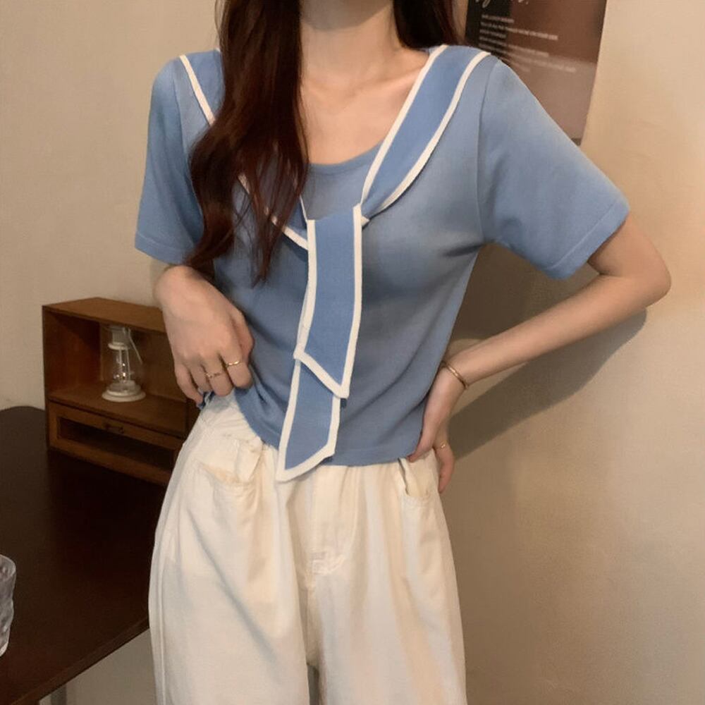 バイカラーのボウタイデザインでカジュアルニットトップス