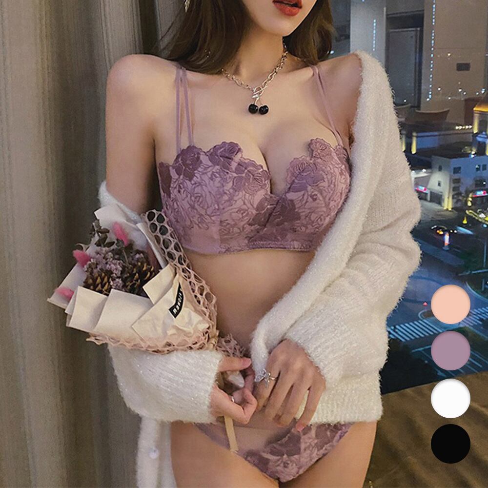 ブラジャー 3/4カップ 花柄刺しゅう レースランジェリーセット 可愛い 盛りブラ 韓国風 美胸ワイヤレスブラ 痛くない
