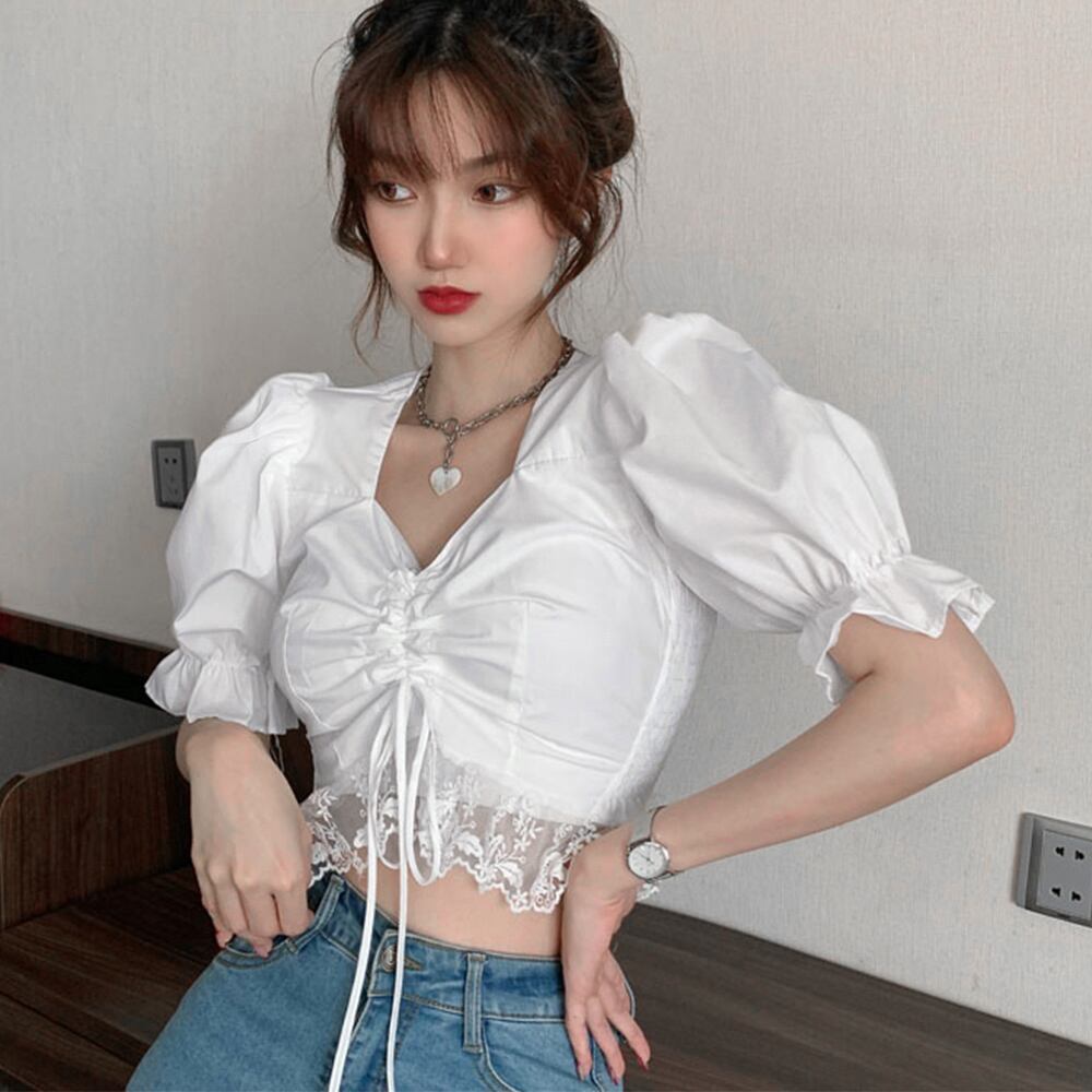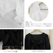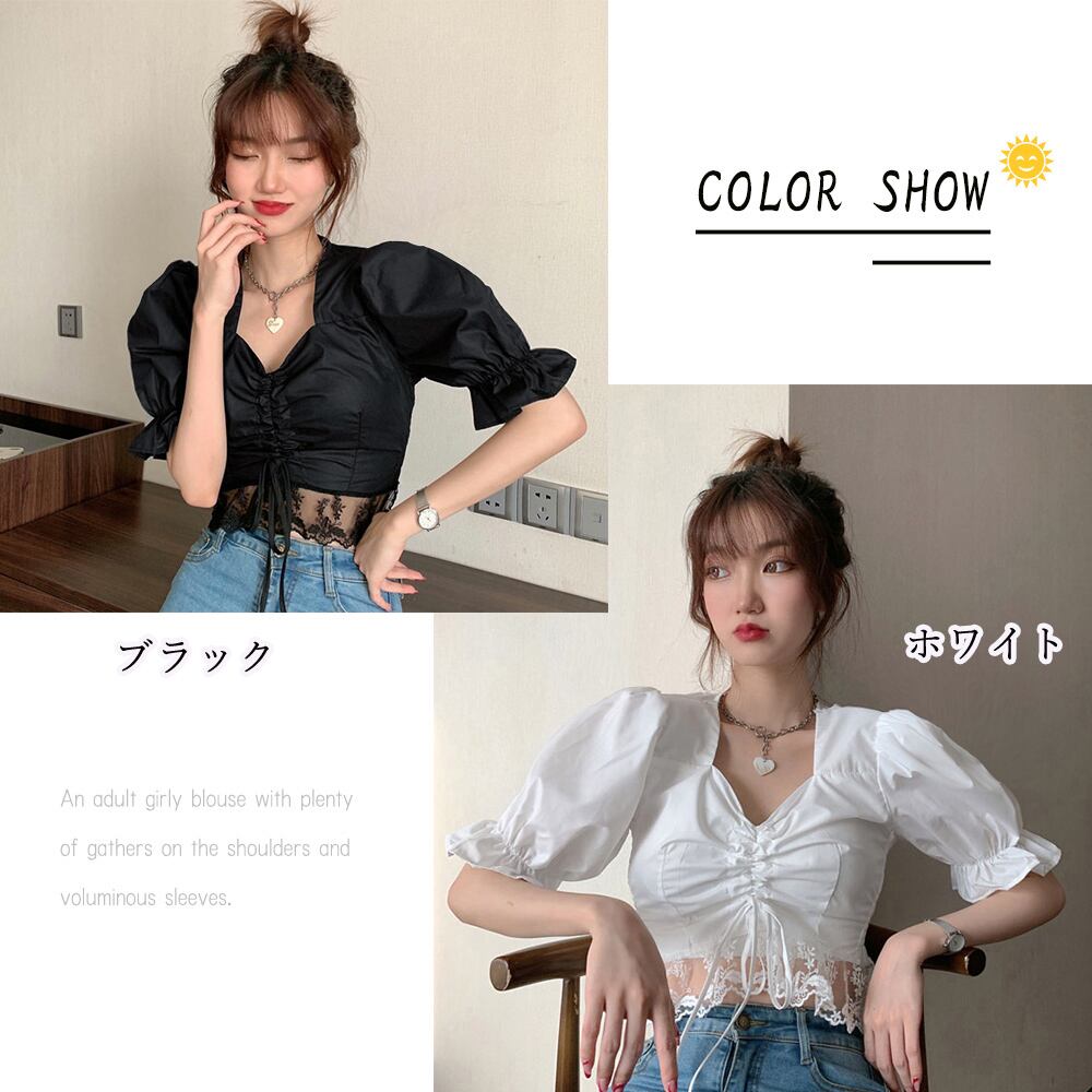 レースアップブラウス ボリューム袖 半袖シャツ レース裾 袖口ゴム トップス 清楚 オルチャン レース切替えトップス 黒