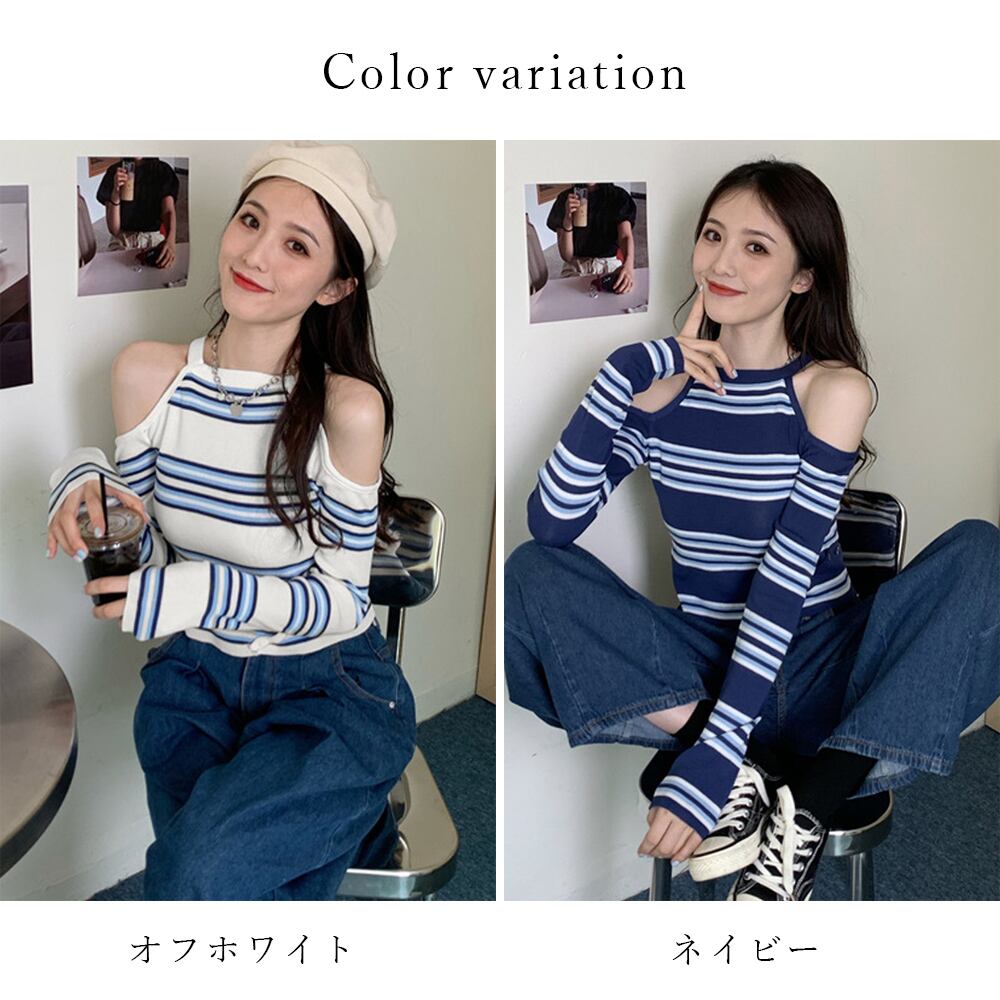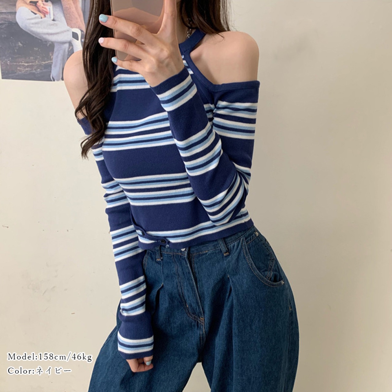 大胆に肩が開いたセクシーなボーダー柄のニットトップス
