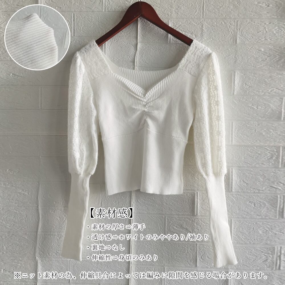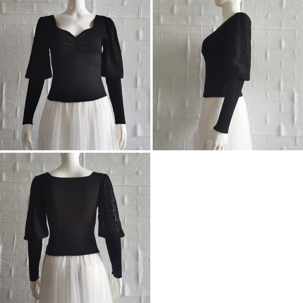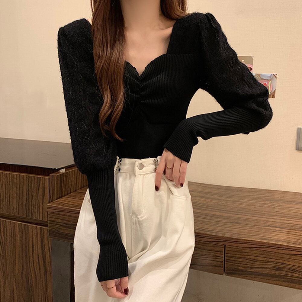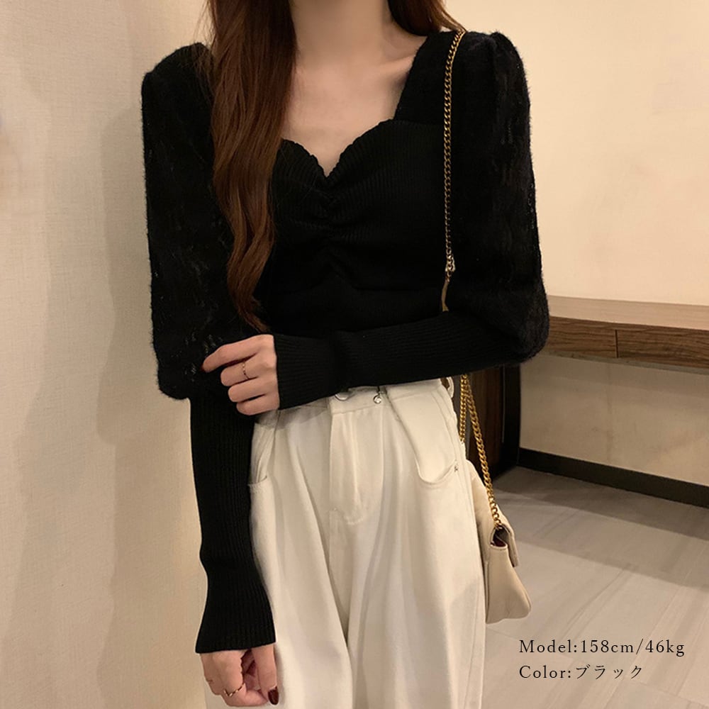 レース切り替え ニットトップス 韓国風