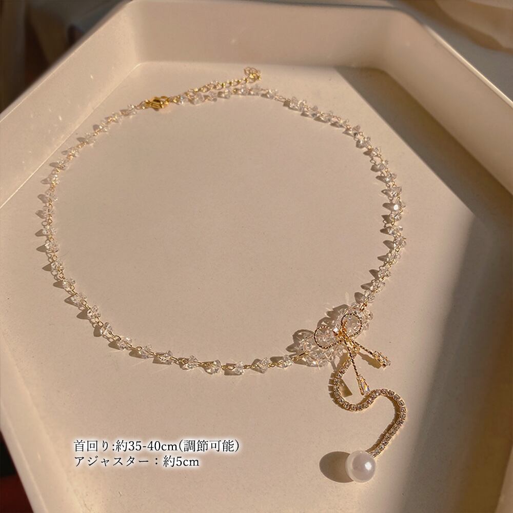 きらきら輝くラインストーンを飾れたリボンモチーフのチェーンネックレス