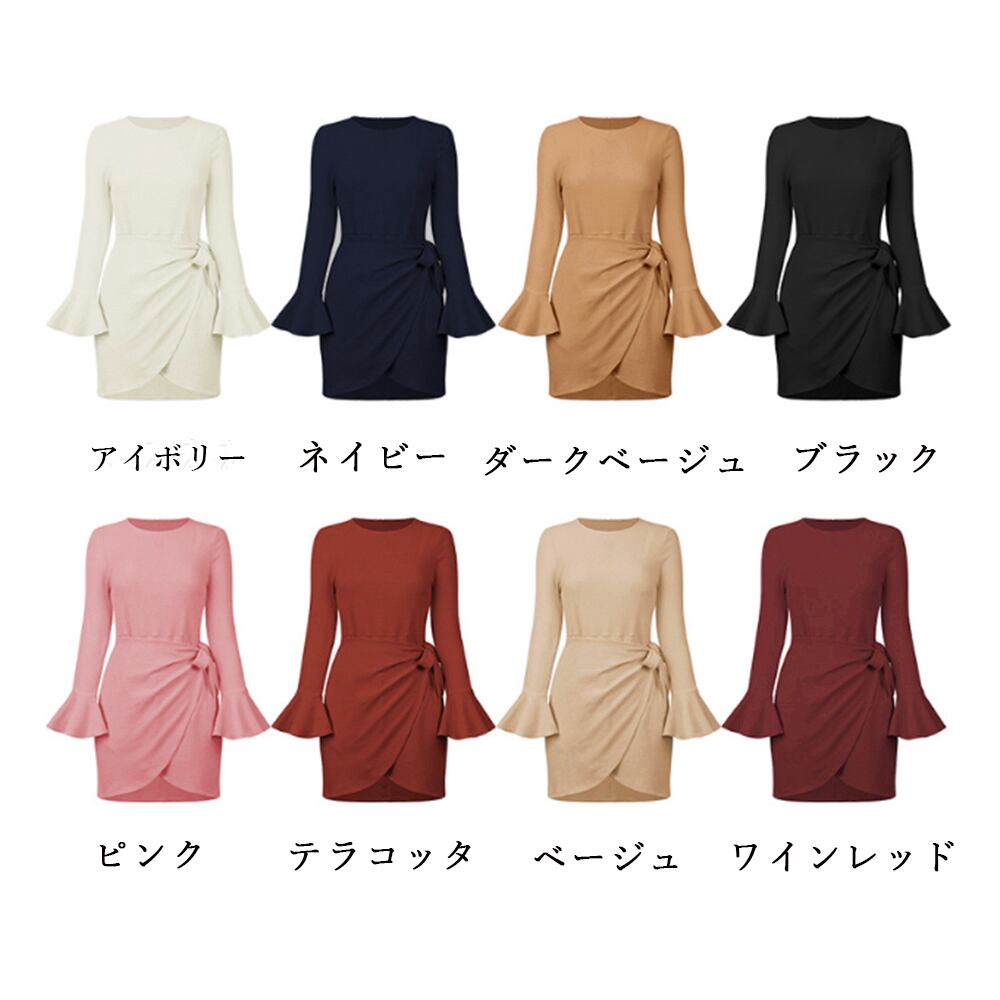 ニットワンピース 大人女性 きれいめワンピ 長袖 リボンウエストマーク タイトワンピース 無地秋冬 フェミニン デート服