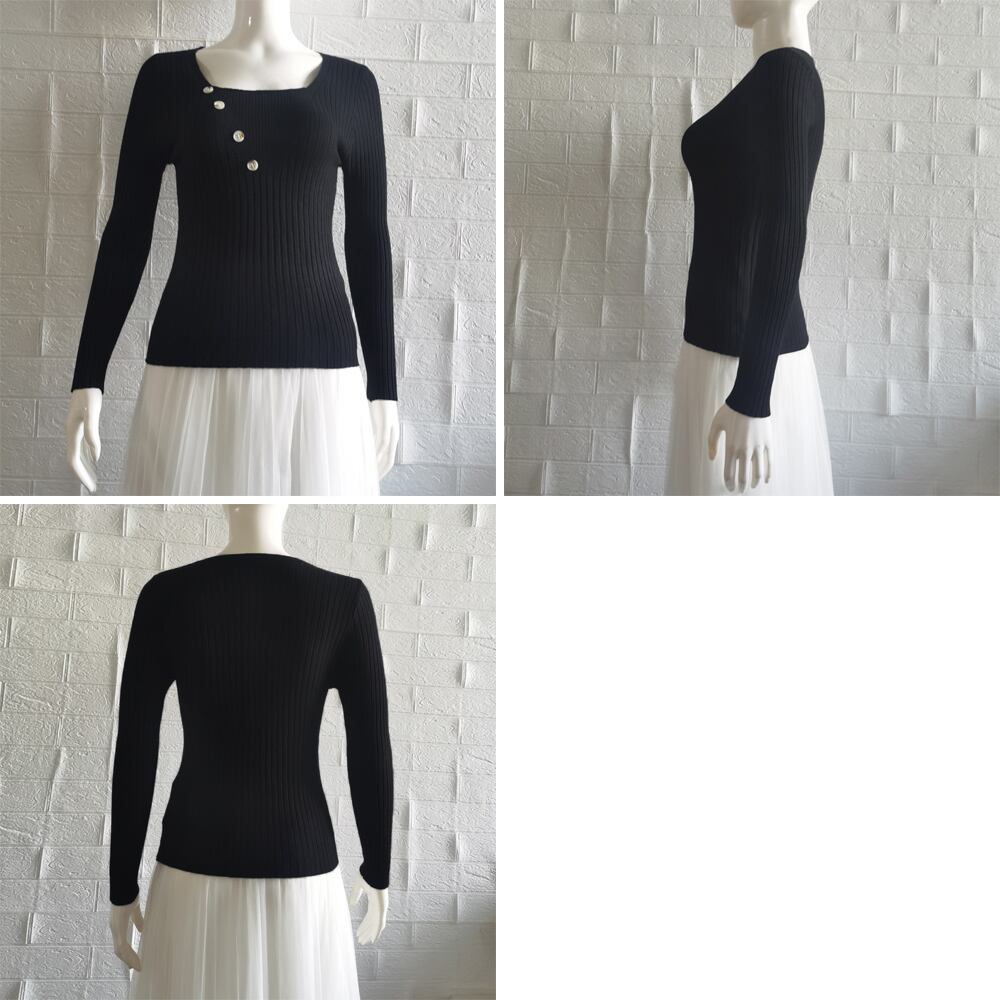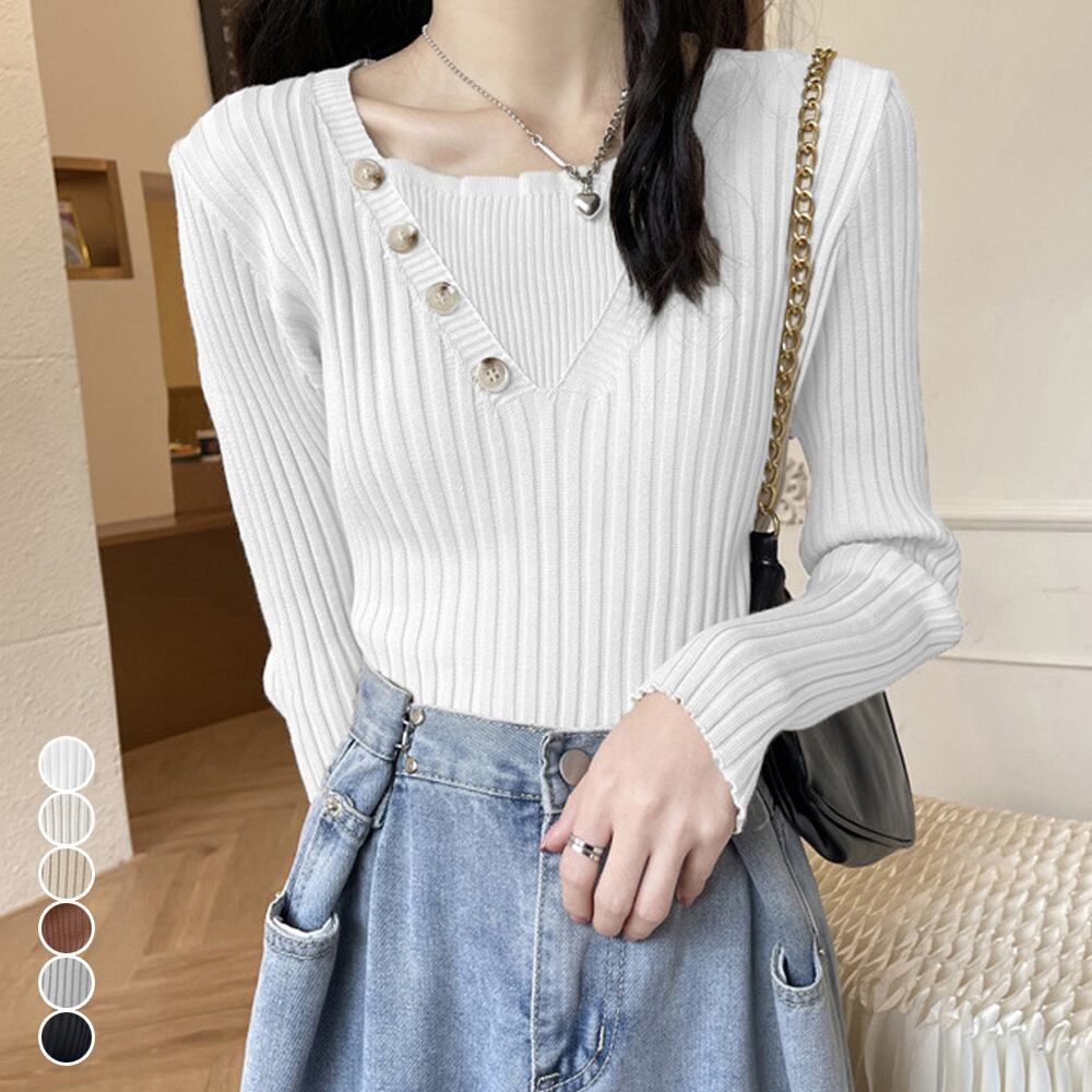 レディース 飾りボタン ニットウェア カジュアル 着やせ ニットセーター スクエアネック 無地ニットソー 着回し 長袖