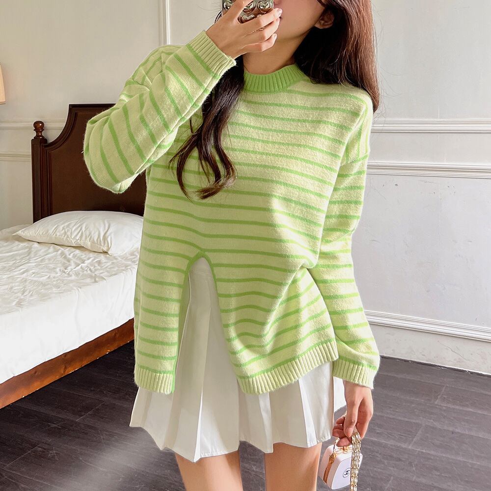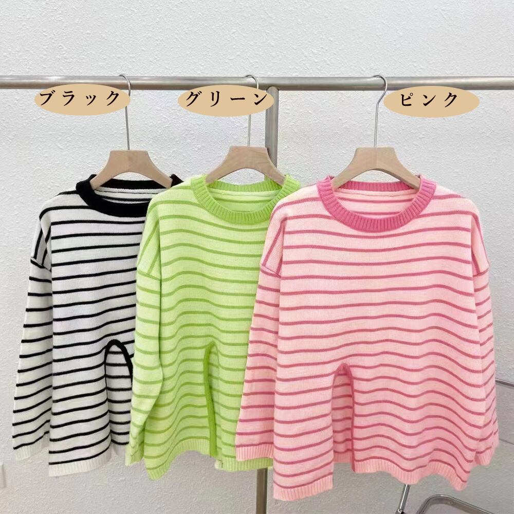 レディース ボーダー柄 ニットセーター カジュアル クルーネック  ニットウェア ドロップショルダー  重ね着ニットソー