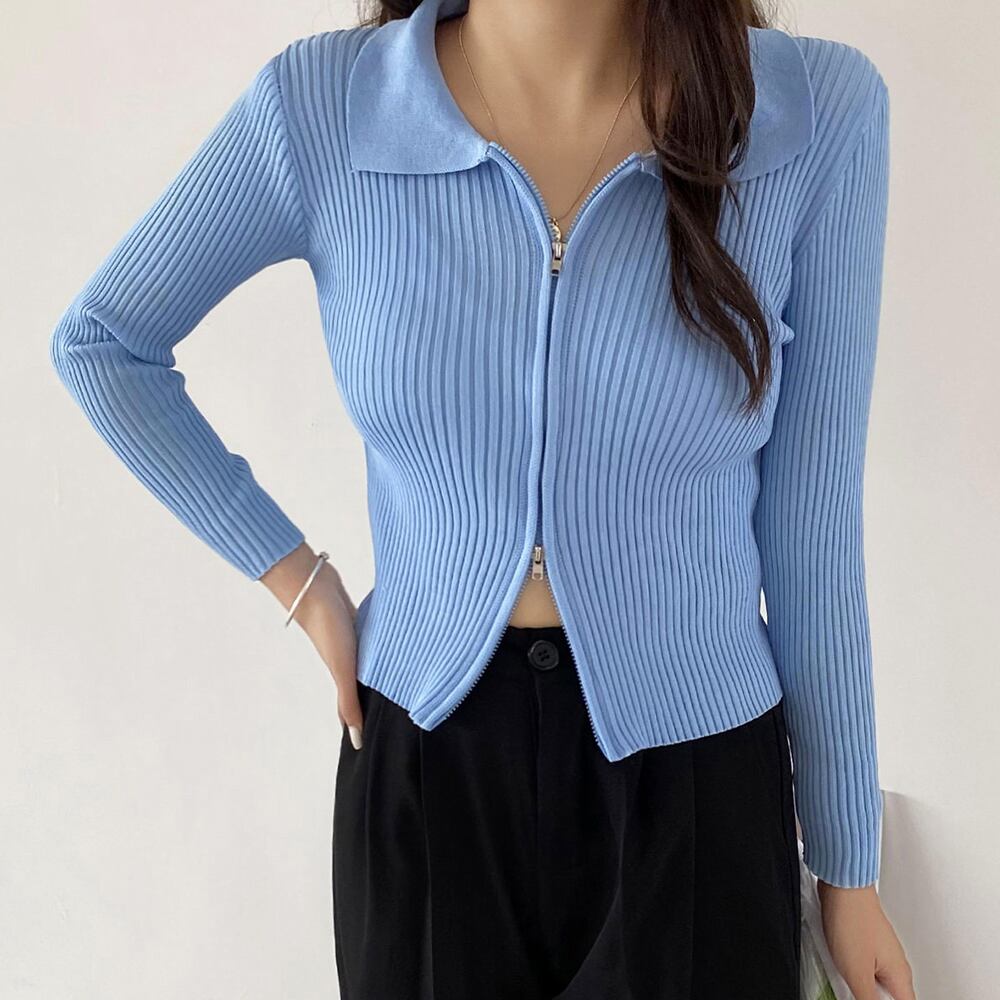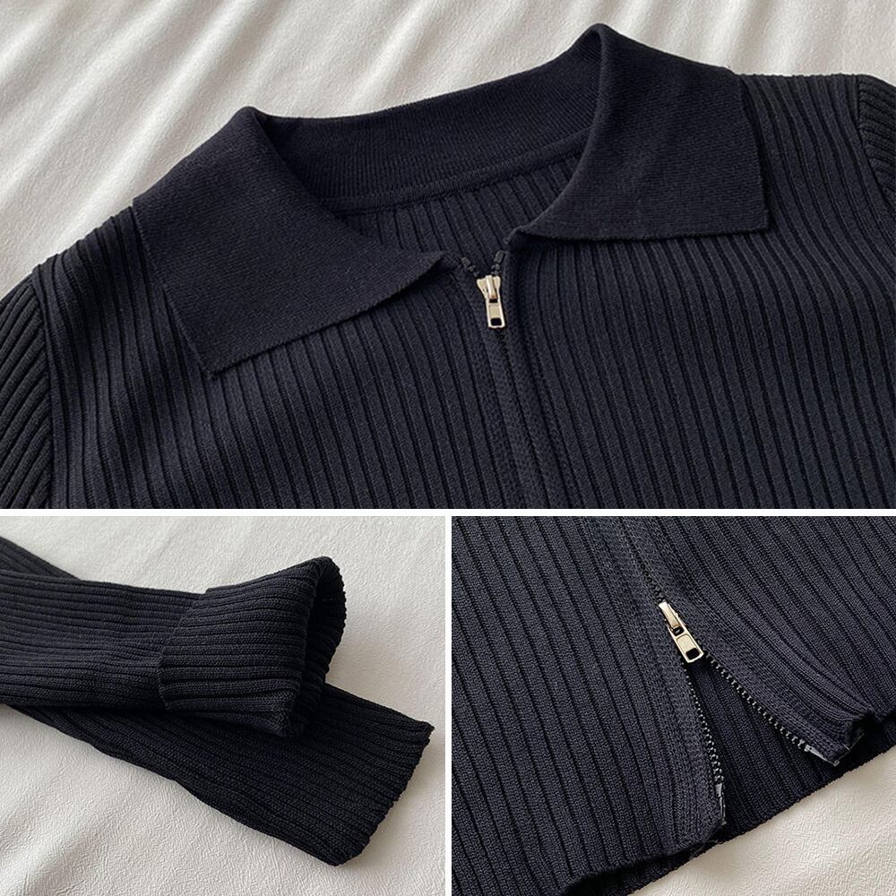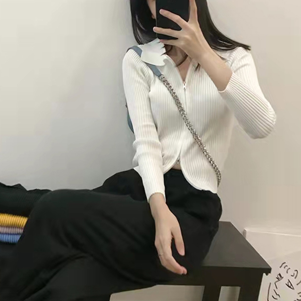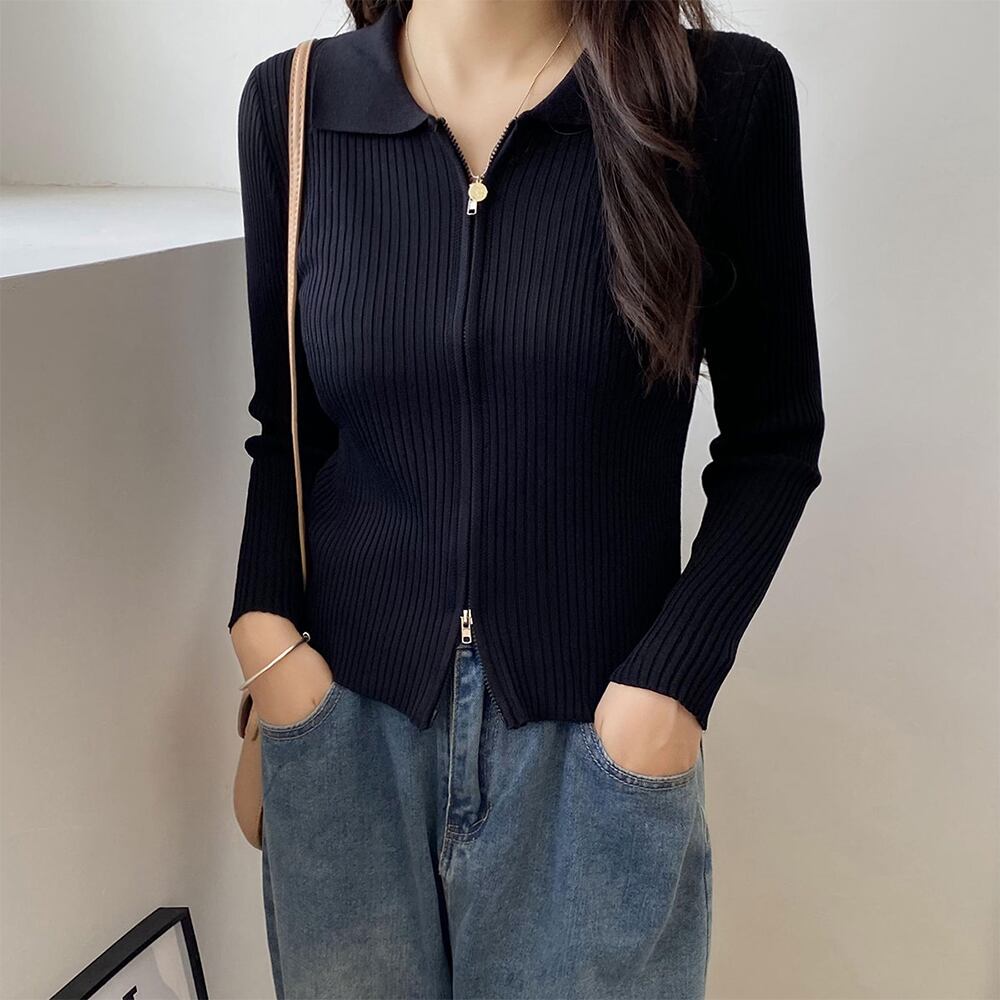 ニットセーター 前開き フィット感 きれいめ フロントZIP ショート丈 Vネック 長袖ニットアウター 無地 オルチャン