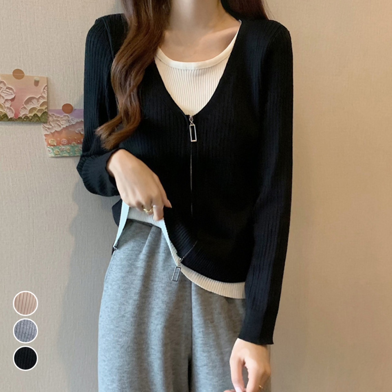 二枚重ねたように見えるバイカラーレイヤード風デザインのニットトップス