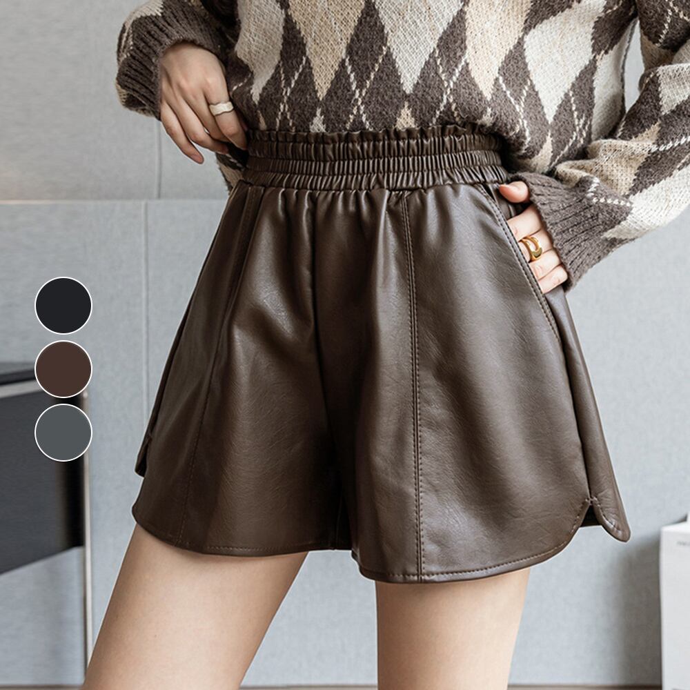 おしゃれ フェイクレザー 短パン ウエストゴム ボトムス ハイウエスト カジュアル 美脚パンツ キュロット 着やせ 秋冬