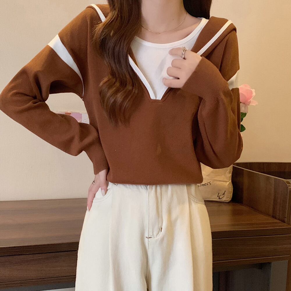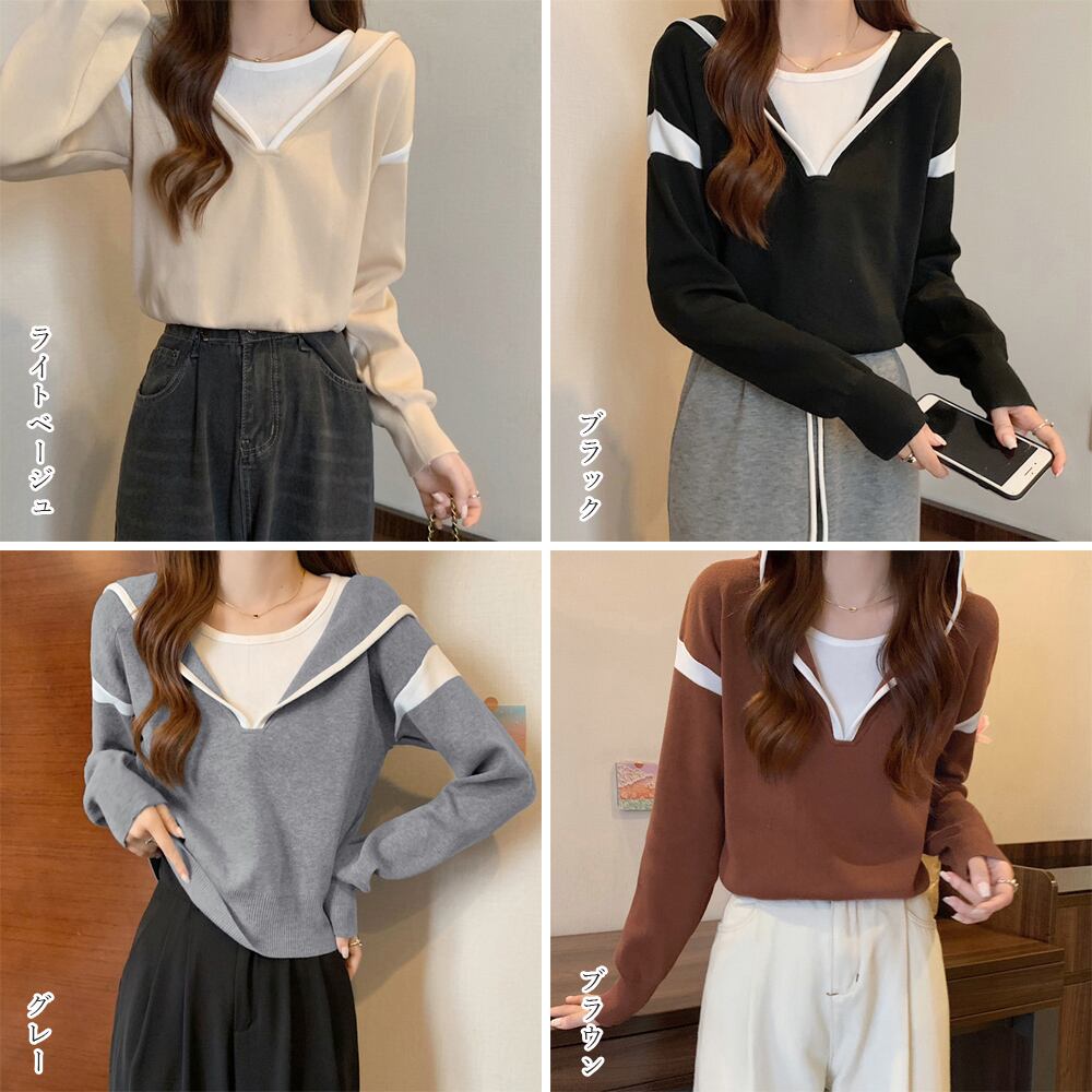 レディース シンプル ニットパーカー カジュアル バイカラーニットソー 長袖 通勤 通学 プルオーバーパーカー 重ね着