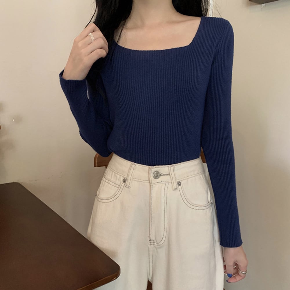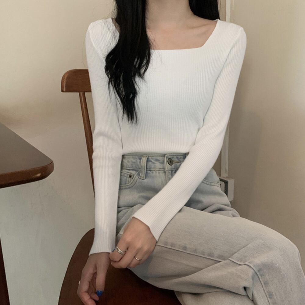 シンプル長袖ニット 着やせ リブニット 女性ニットソー無地