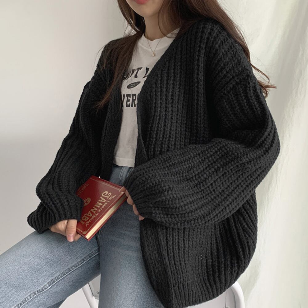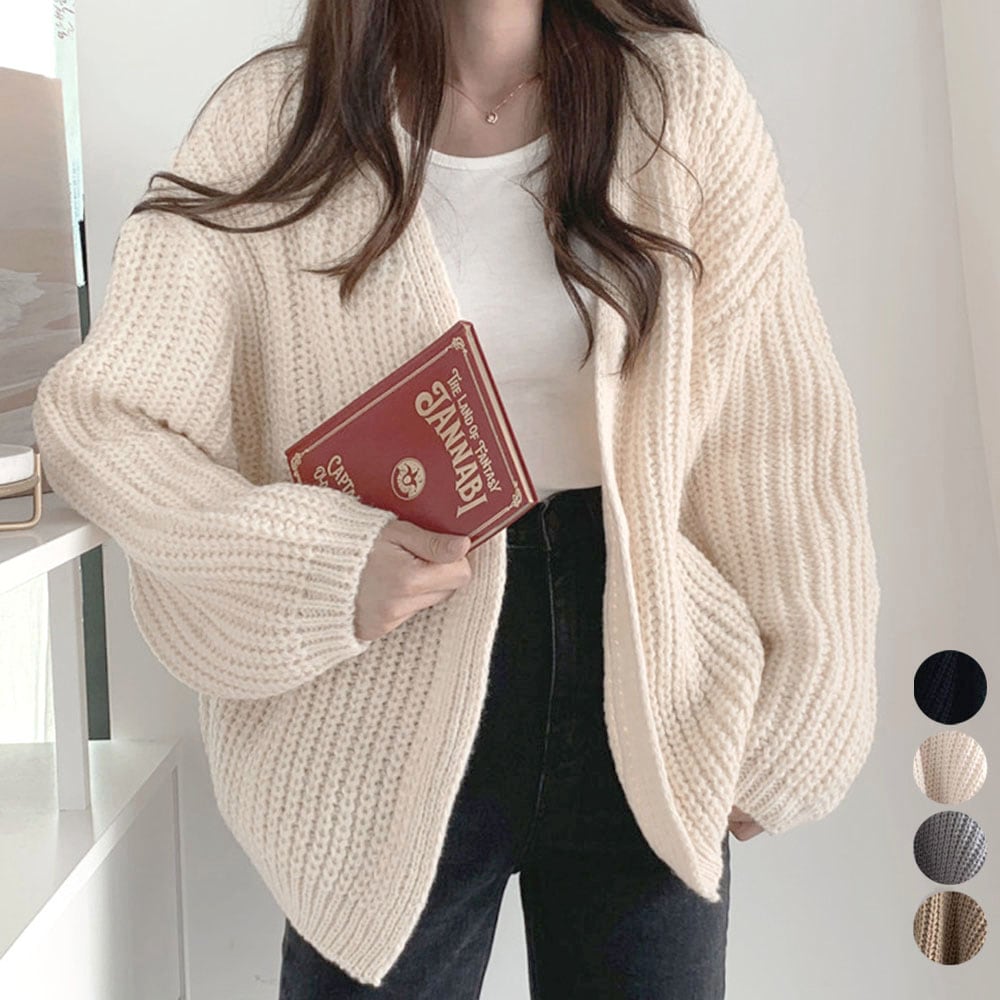 カーディガン 韓国風 ゆるニットトップス 体型カバー ボリューム袖 長袖 ニットアウター 羽織り 春秋服 大人カジュアル
