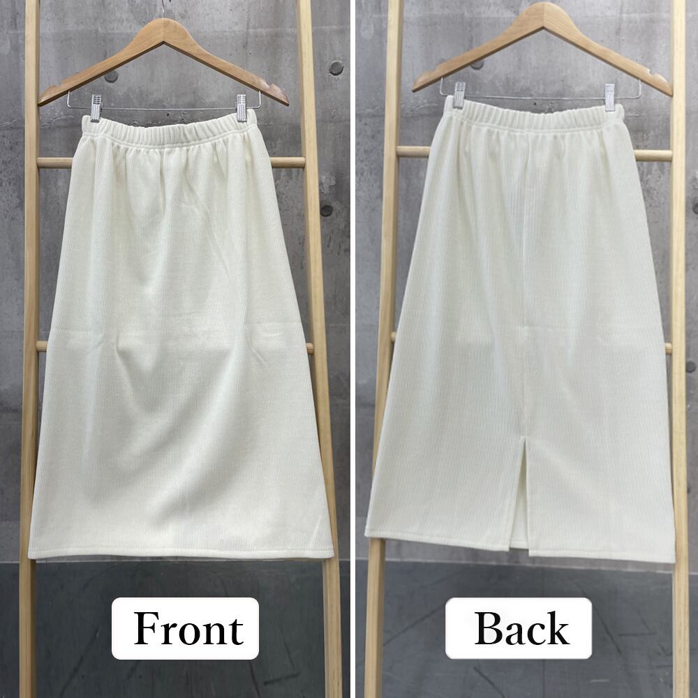 ウエストはゴム入りで楽ちん仕様、バックスリットで歩きやすい