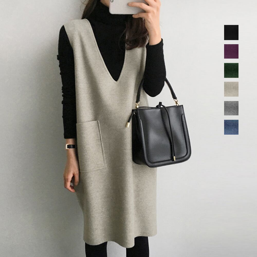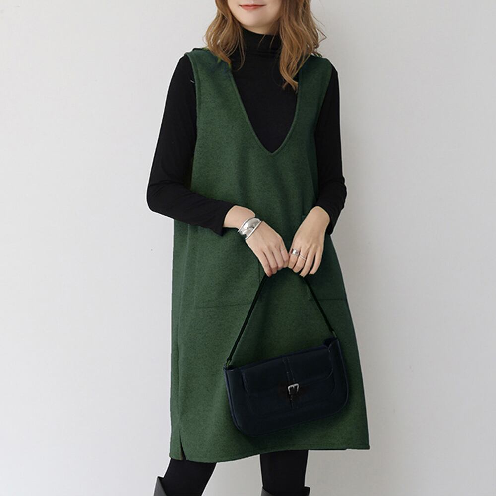 Vネックワンピース ポケット付き ノースリーブワンピ 暖かい 体型カバー タンクワンピース オーバーオール 秋冬 韓国
