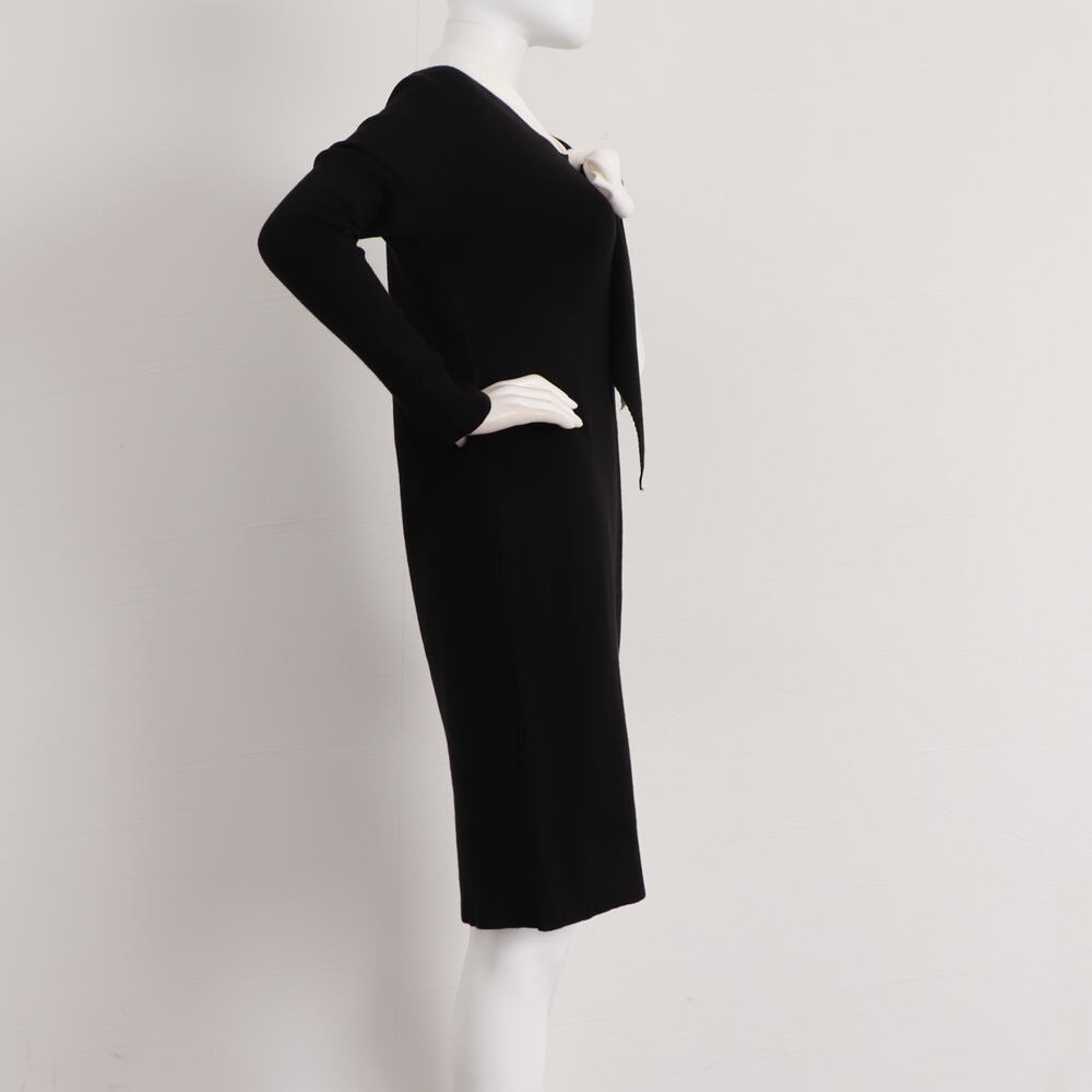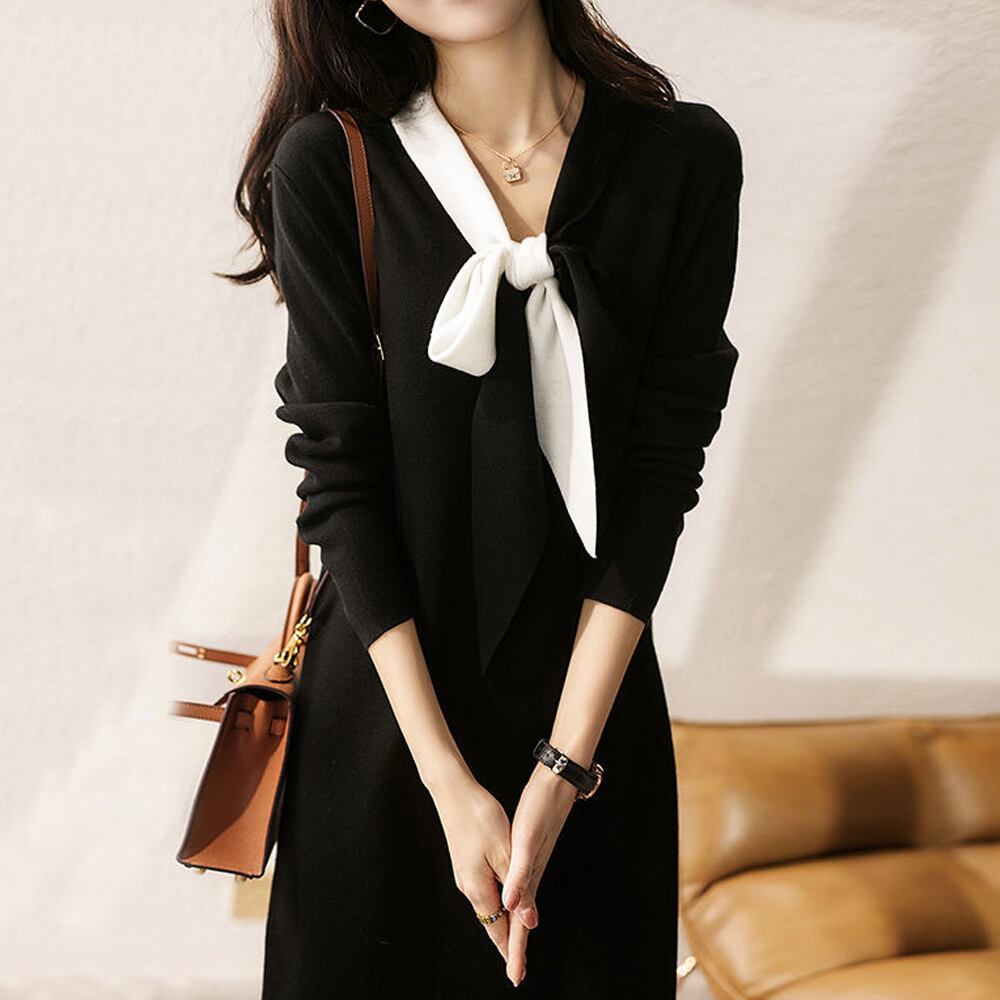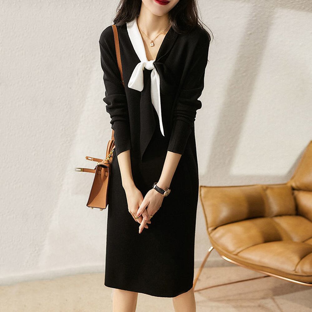 レディース きれいめ リボンボウタイ ワンピース 大人女性 オフィスカジュアル 配色ワンピ フェミニン 長袖
