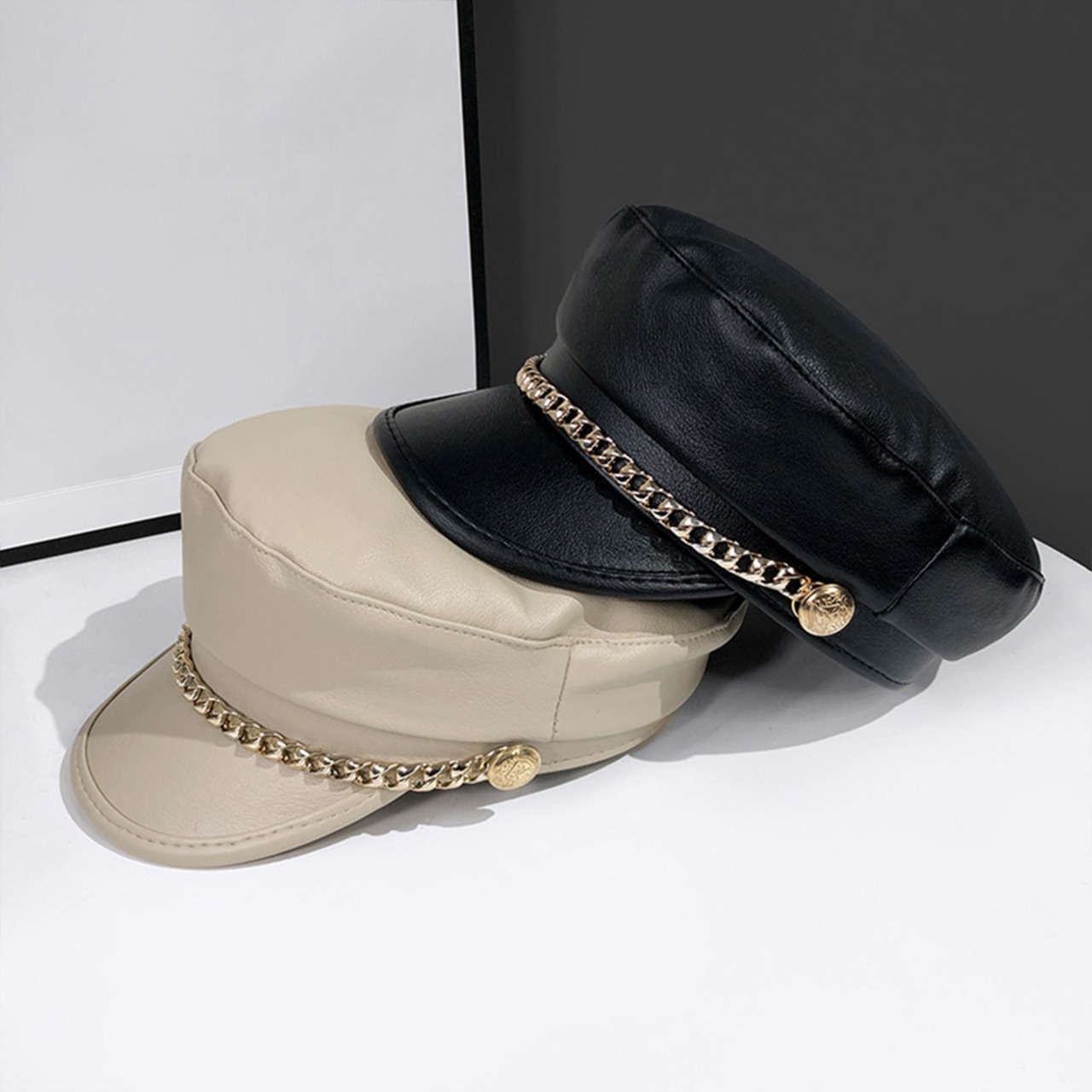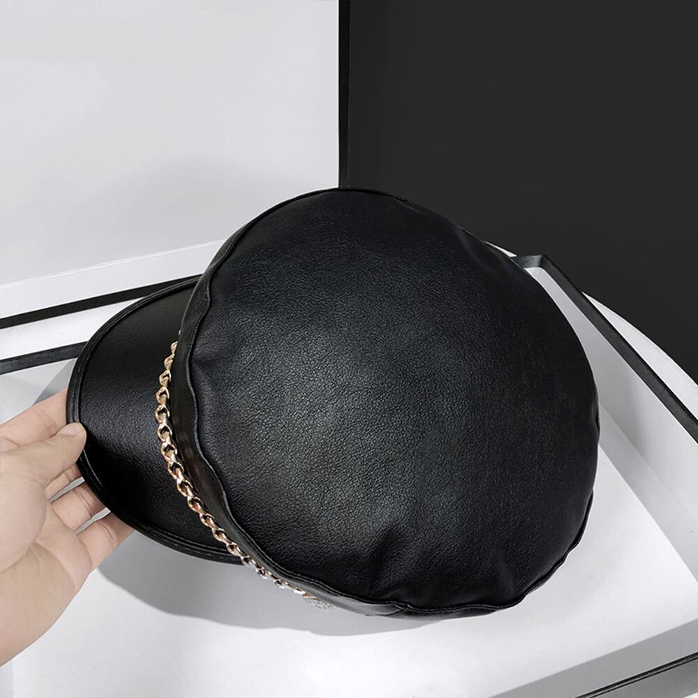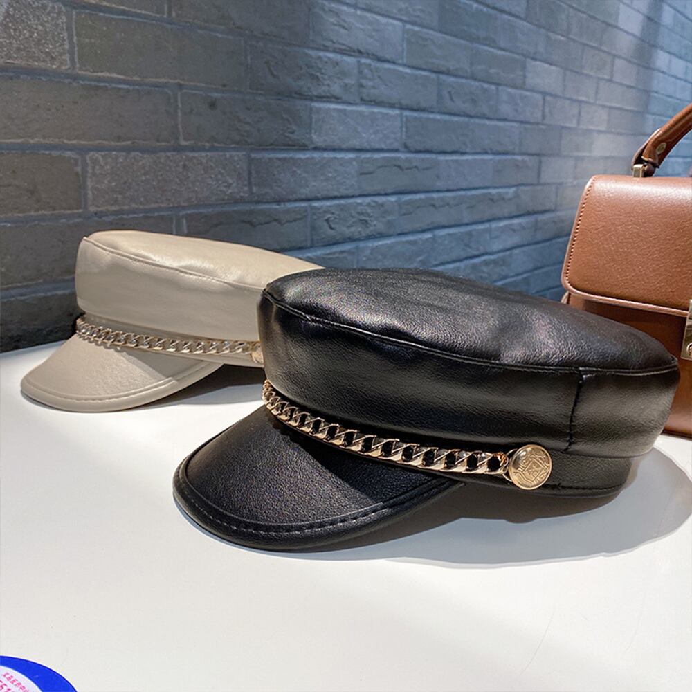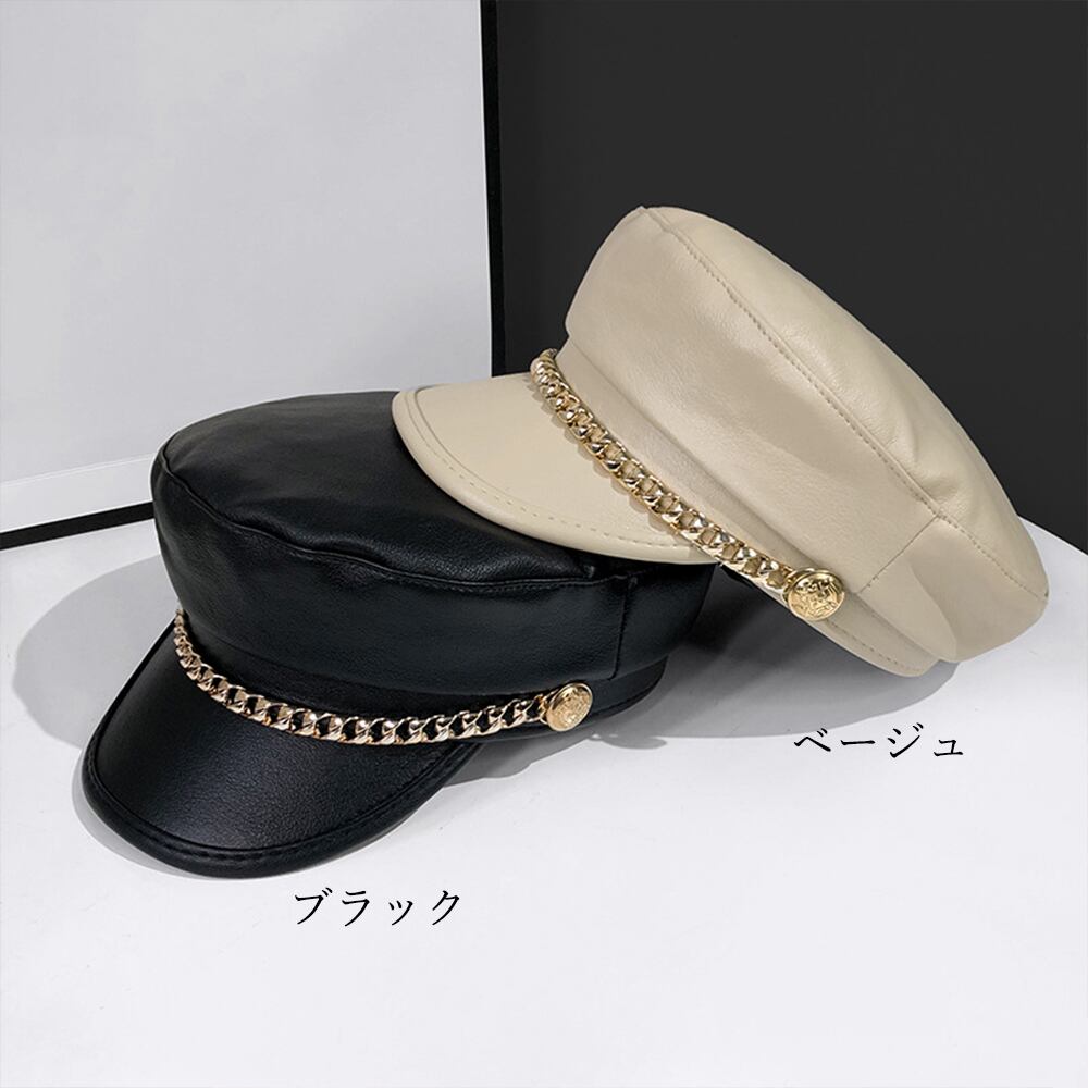 フェイクレザーキャスケット チェーン付き 帽子 合皮キャップ マドロスハット マリンハット PUレザーキャップ秋冬女の子