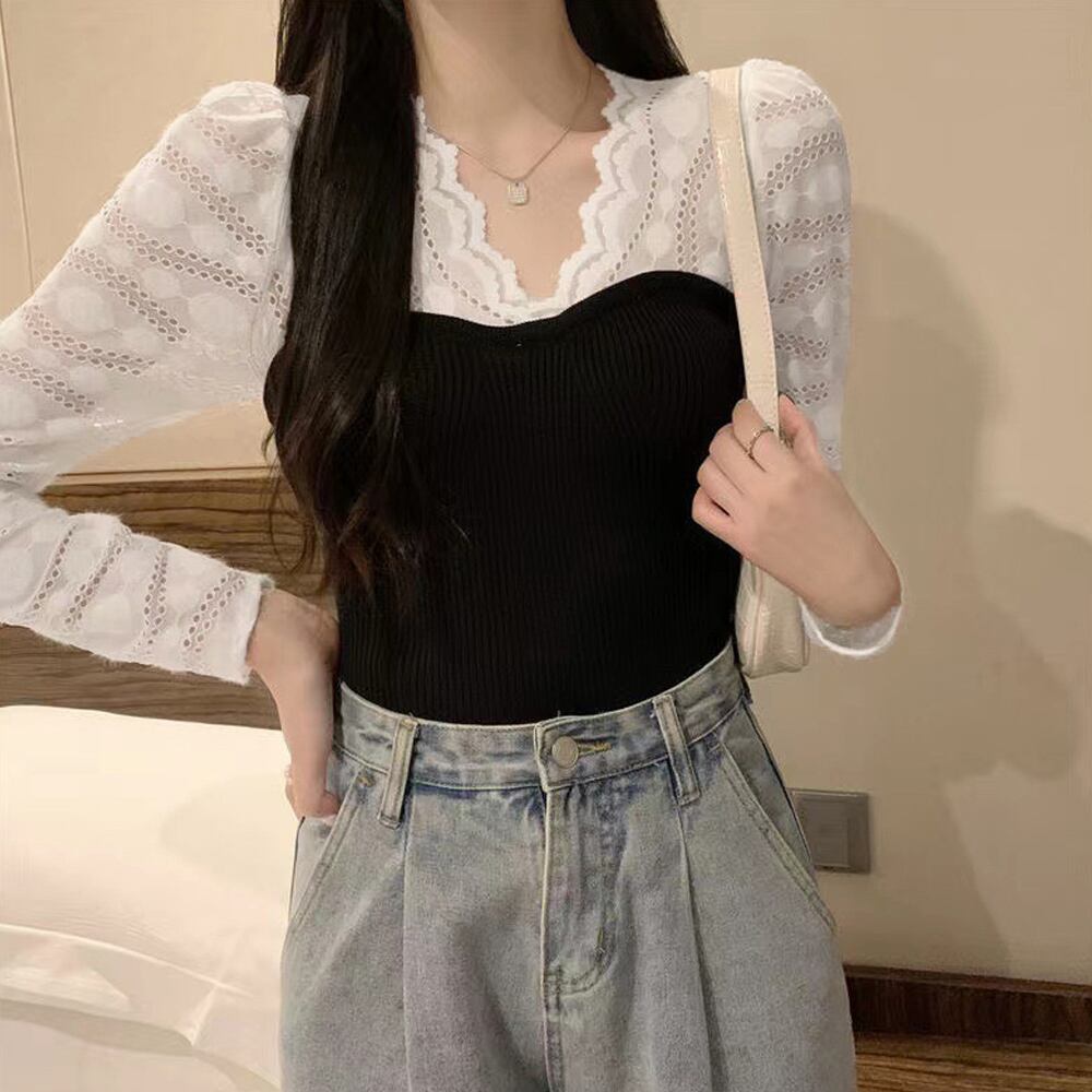 レースの切り替えでデコルテ、袖や背中見せるリブニットトップス