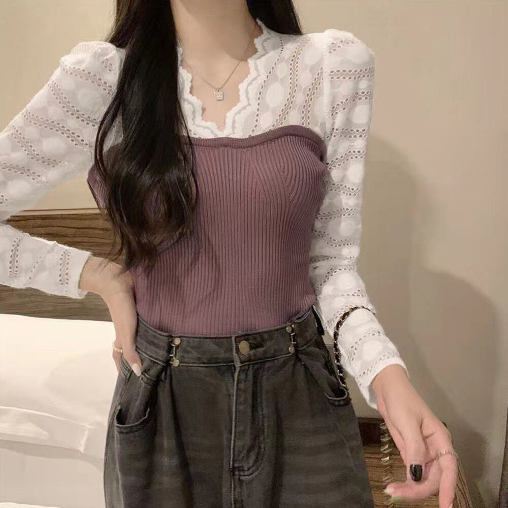 レースニットウェア Vネックリブニット 着やせ ブラウス