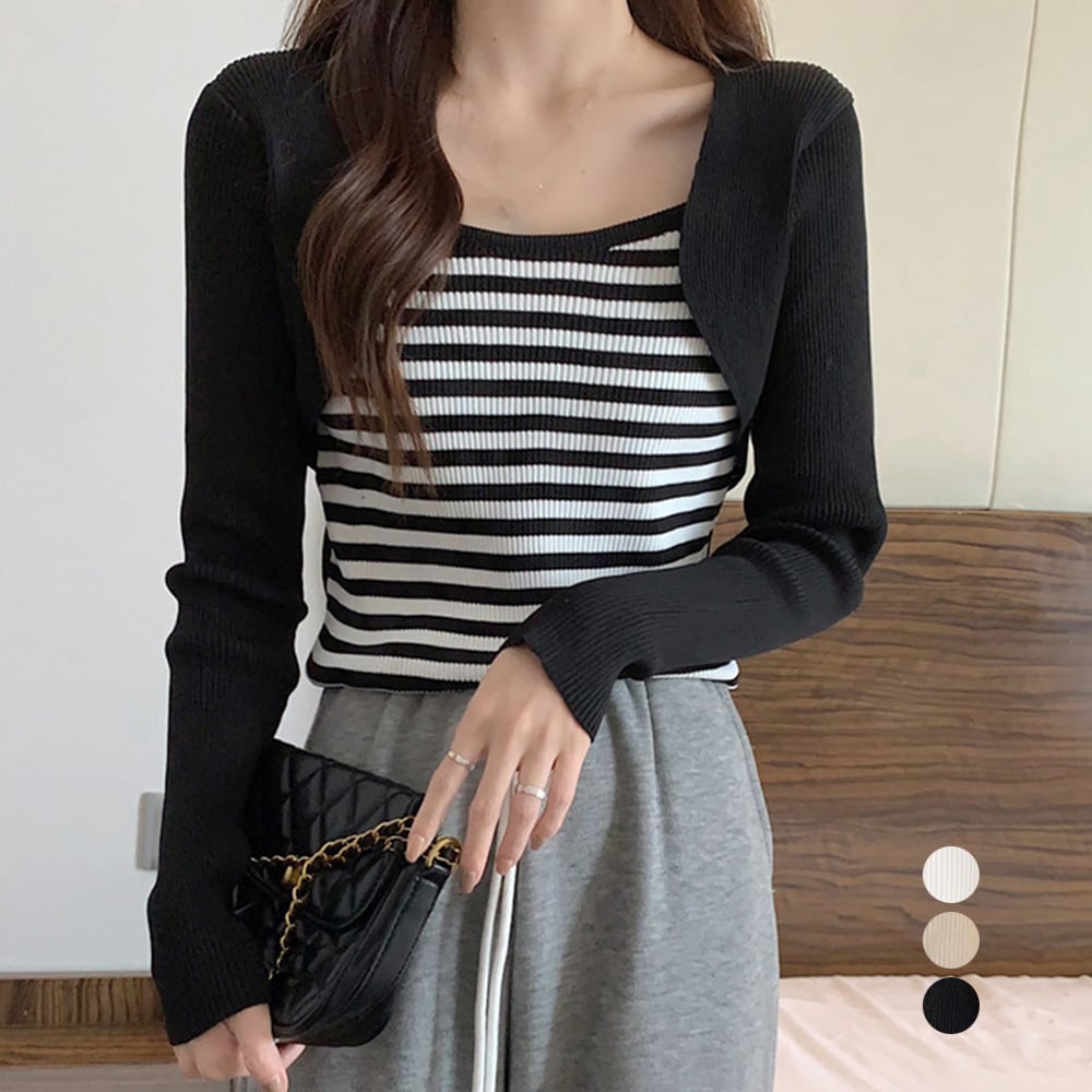 ボーダー柄身頃と無地袖を合わせたレイヤード風デザインが目を惹くスクエアネックニットトップス