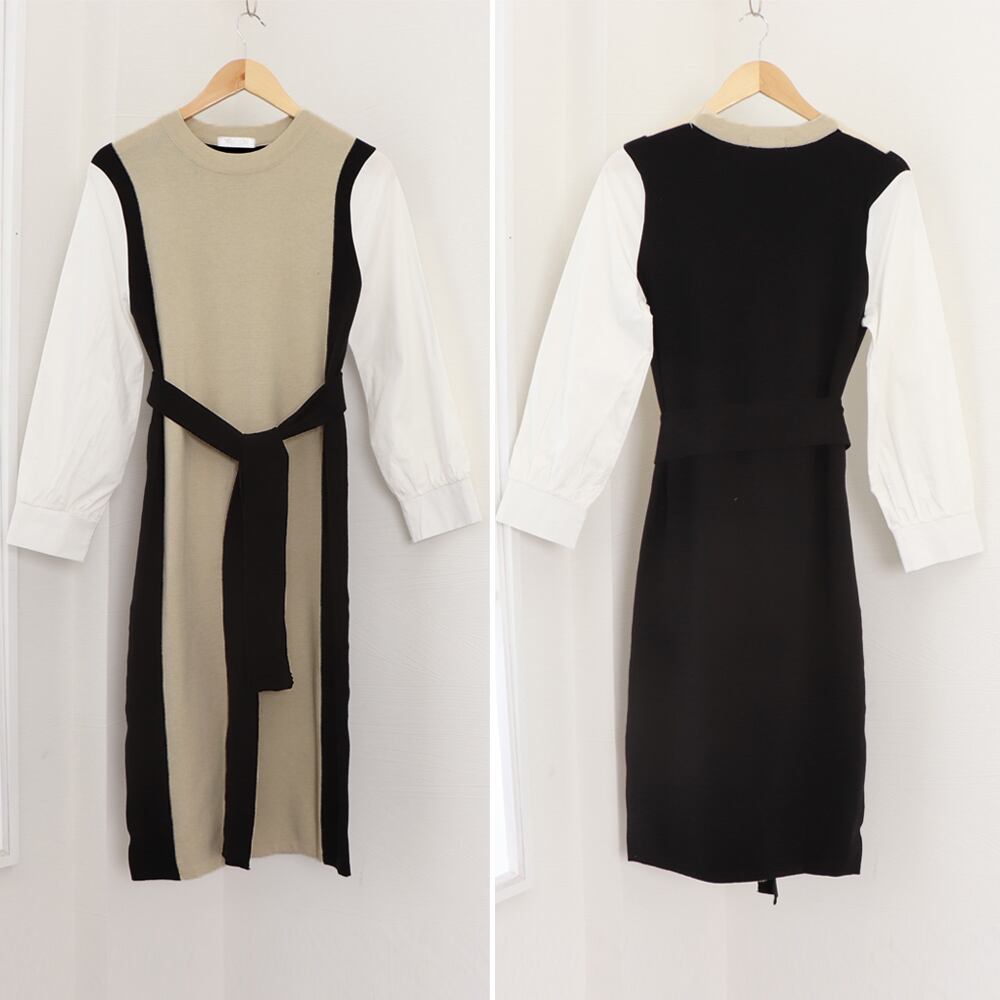 袖切り替え ニットワンピース ロング配色