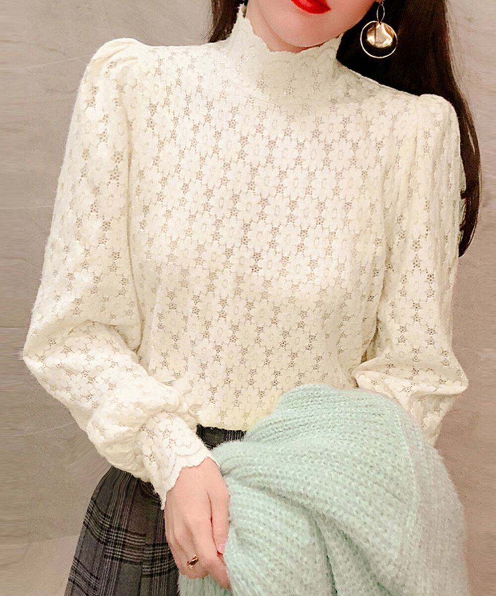 ふんわりとボリューム感のある袖のシルエットが可愛い、フラワー柄やレース仕様がポイント、フェミニンの魅力を演出してくれるハイネックブラウス