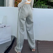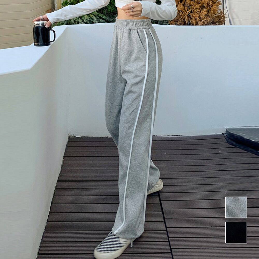 両サイドに裾に向かって緩やかに広がる2本ラインデザイン、脚をすっきり魅せるスウェットパンツ