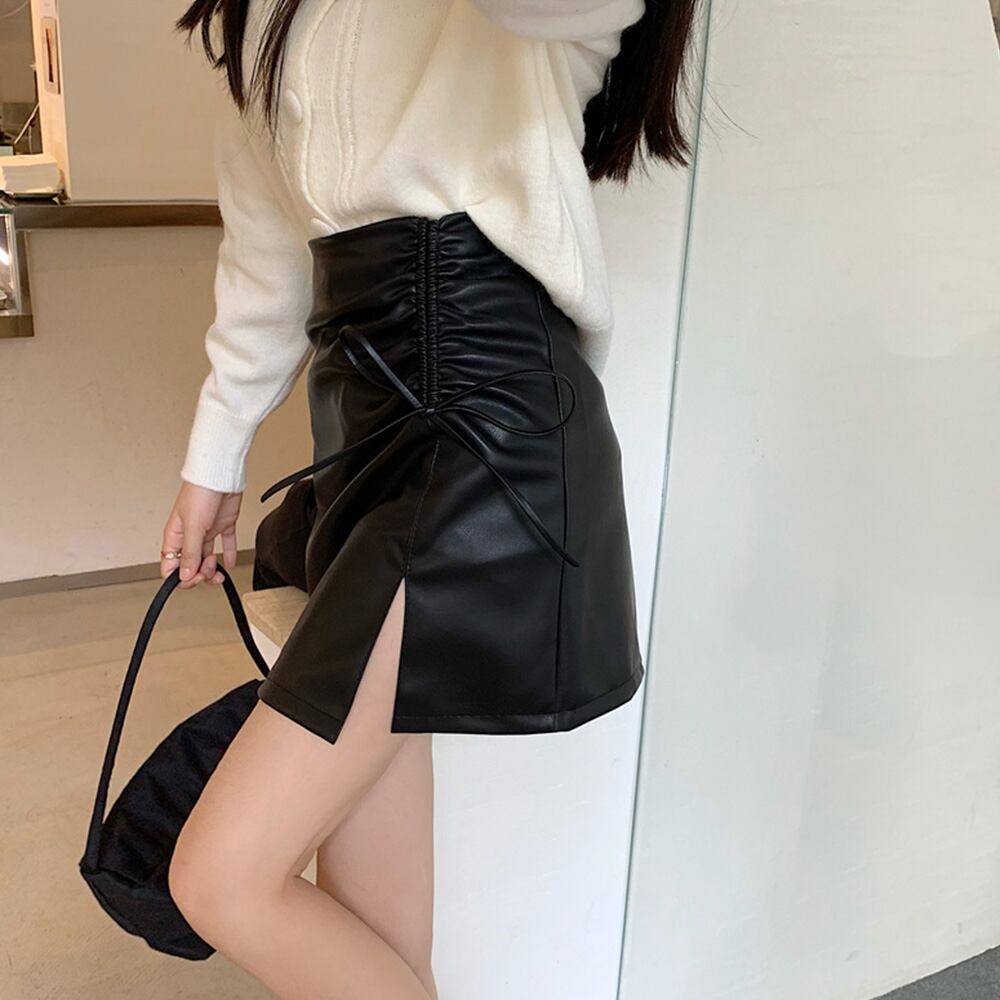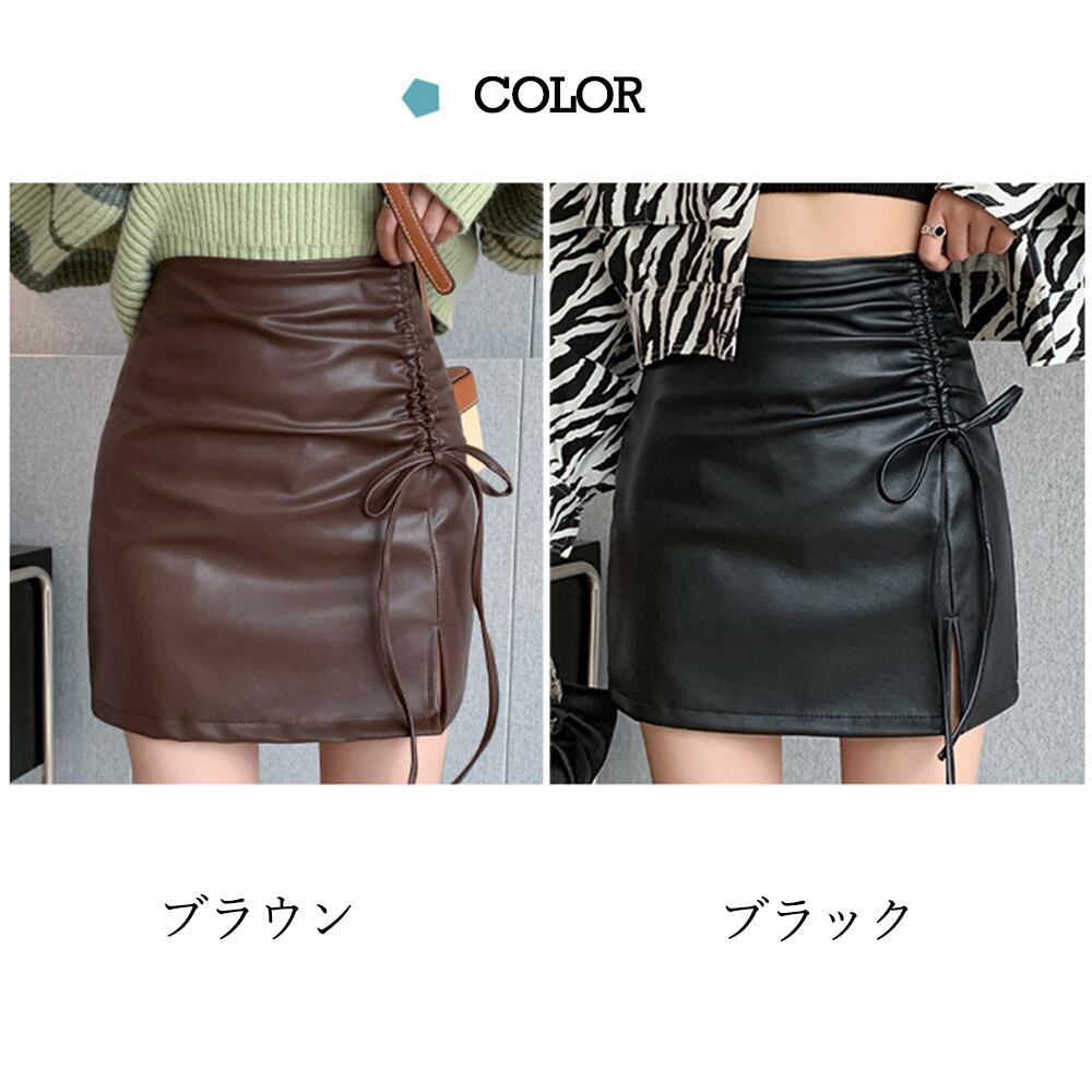 レディース ギャザー ハイウエスト 台形スカート 美脚脚長  韓国 フェイクレザースカート 黒 ミニ丈 ボトムス 着やせ