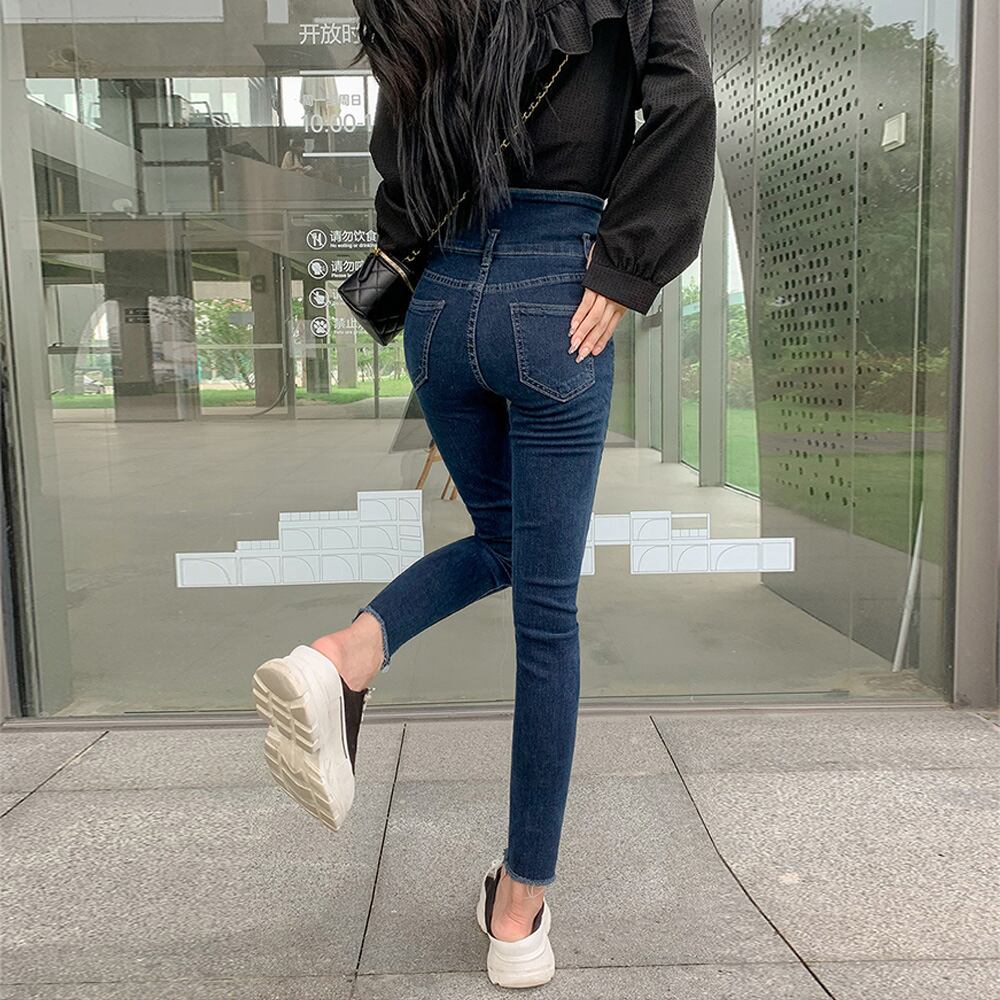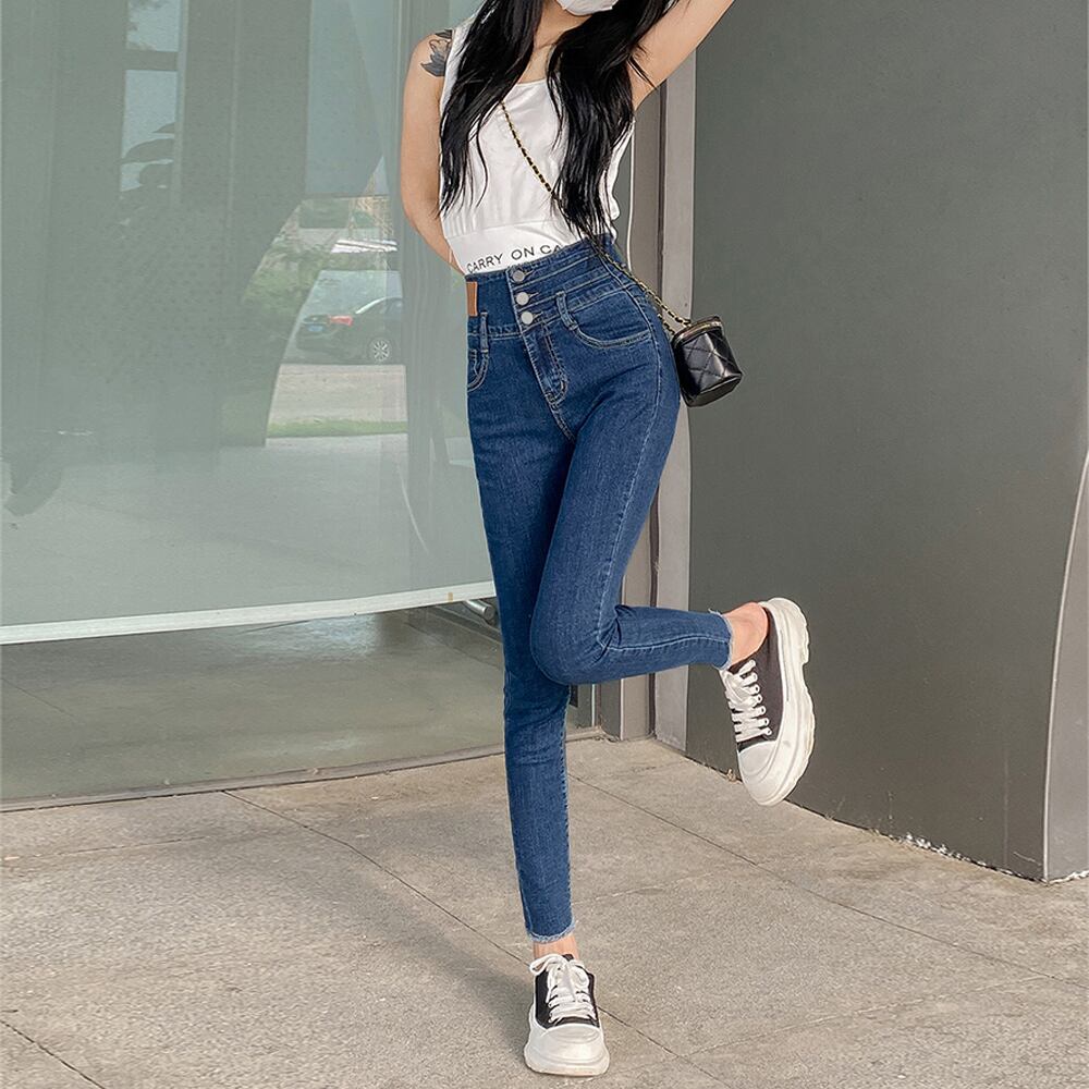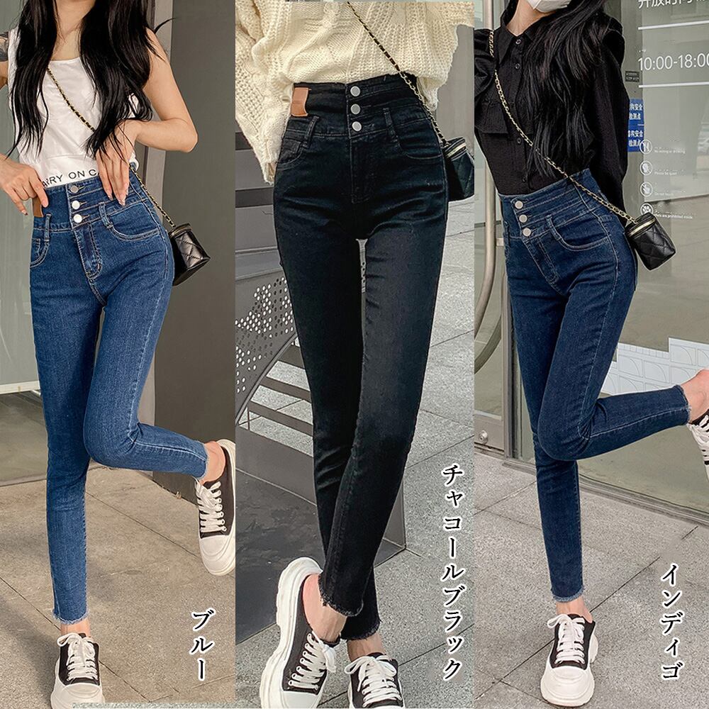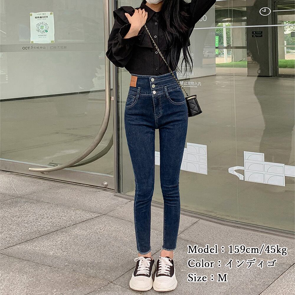 ハイウエスト 3連ボタン スキニーパンツ  細見え ジーパン きれいめ ロングパンツ 着やせ 韓国風 ボトムス 美脚脚長
