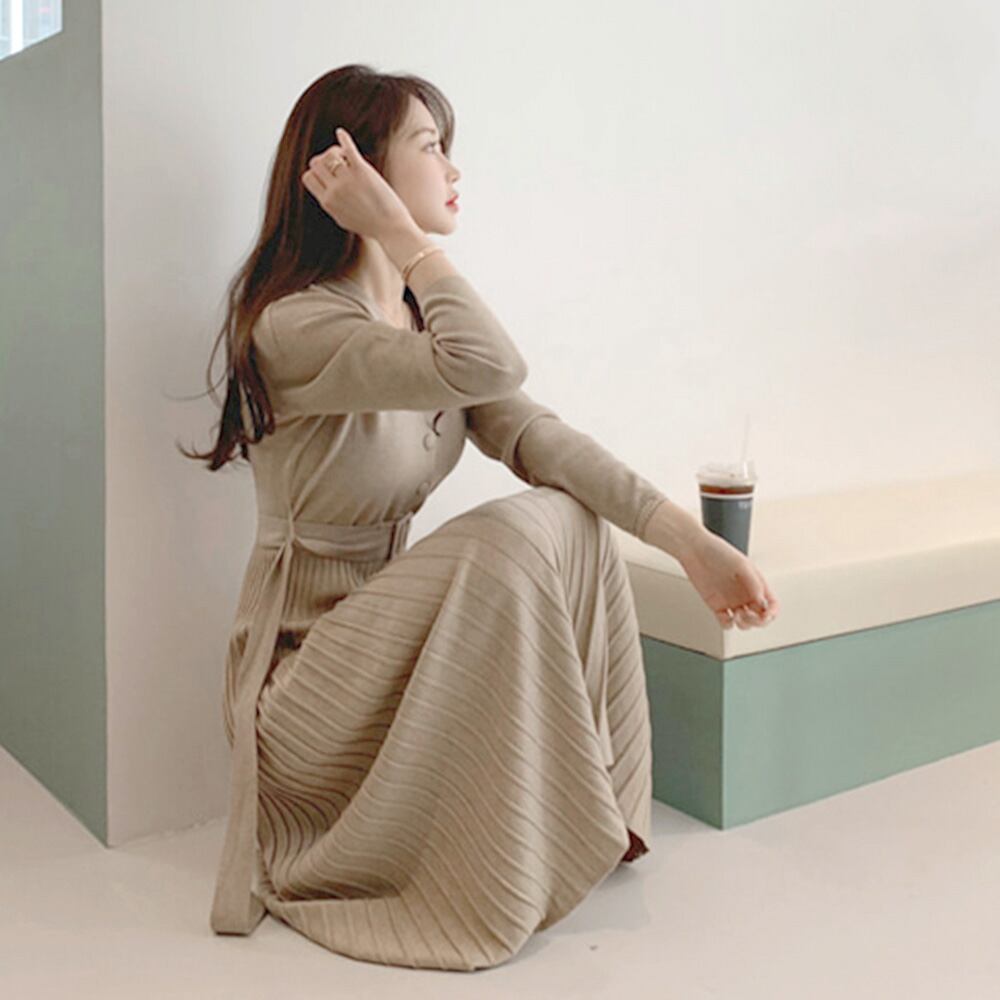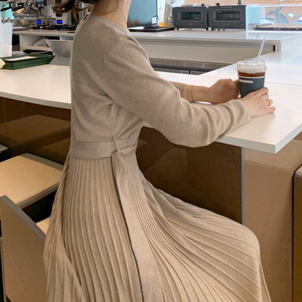 ミモレ丈 フレアワンピース レディース 韓国秋冬 プリーツワンピース Aライン長袖ワンピ Vネックフェミニン ベルト付き