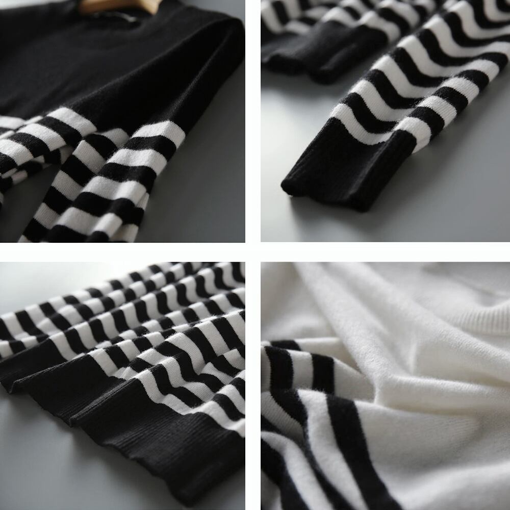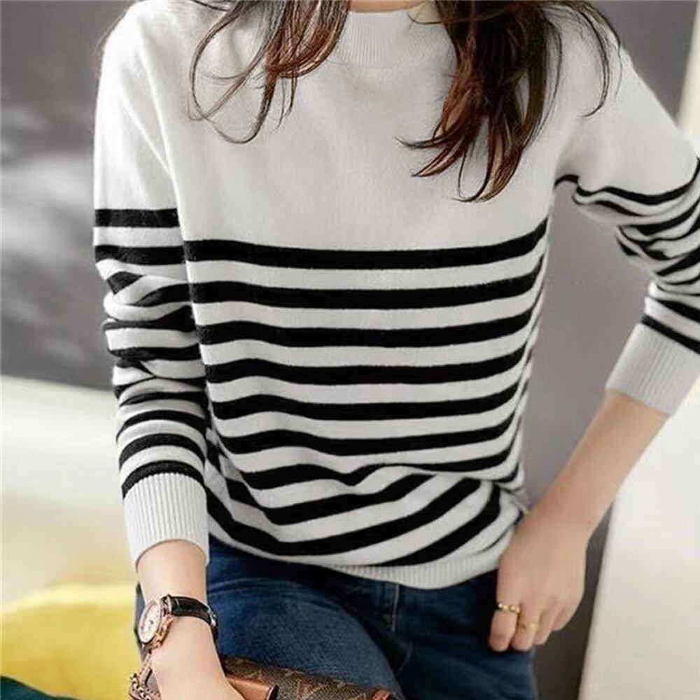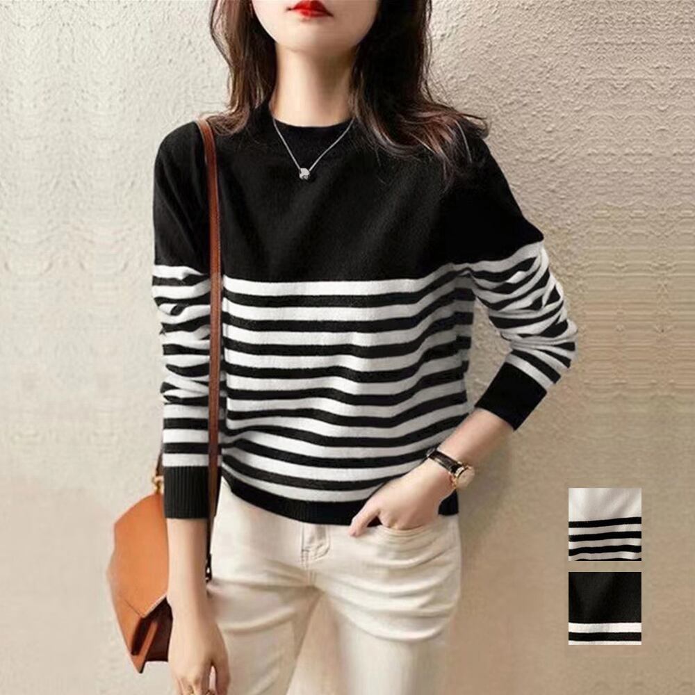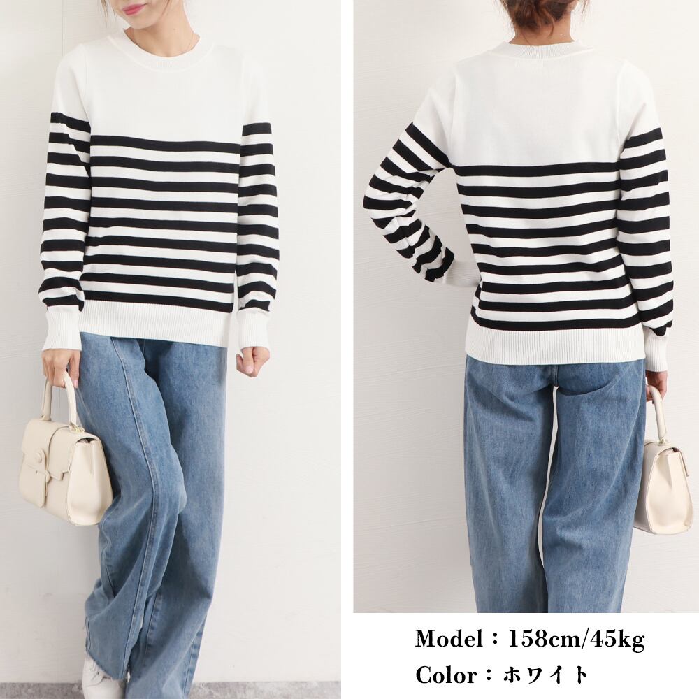 春秋に欠かせない定番のアイテム間違いなし、カジュアルなデザインで若い印象を与えるボーダー柄ニットセータ