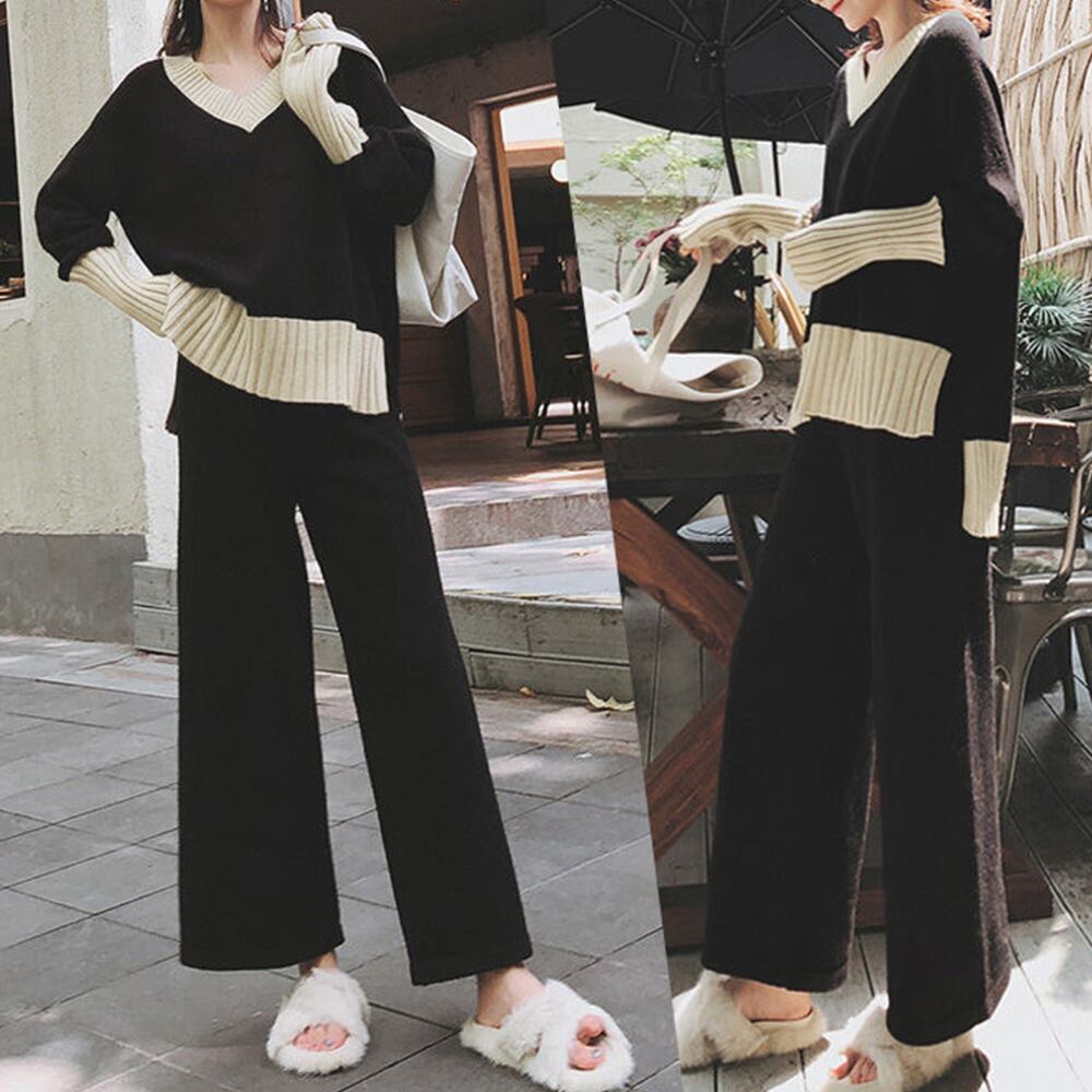 首元が綺麗に見えるV ネックトップスとリラクシーなニットワイドパンツのセットアップ