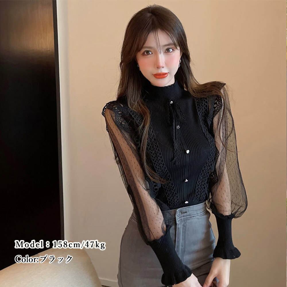 透け感パフスリーブ ぽわん袖 トップス 春秋冬 ニットソー
