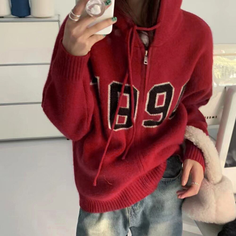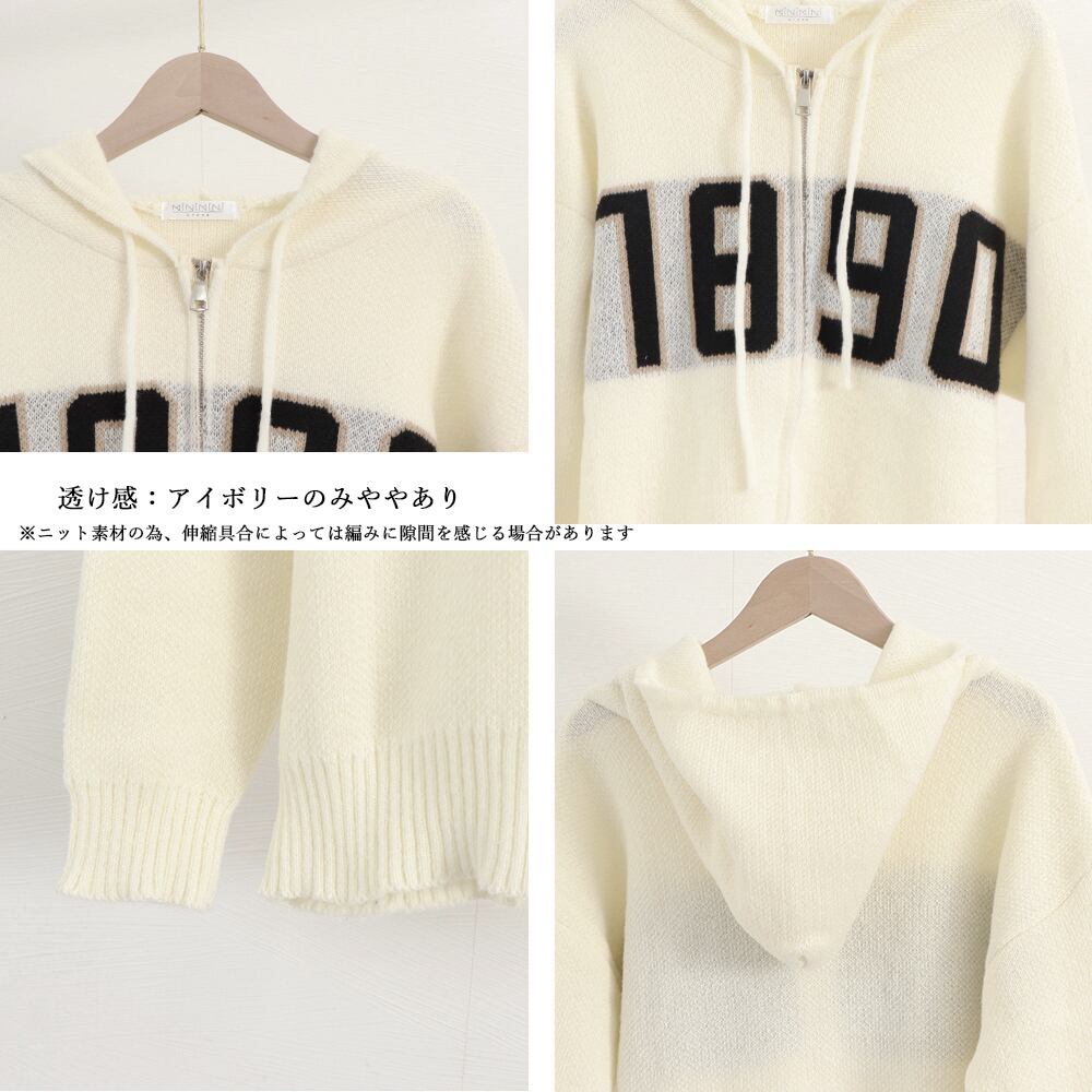 ジップアップ ニットアウター レディース カレッジロゴ 長袖 中厚手ニット羽織 着やせフーデッドカーデ 韓国 カジュアル