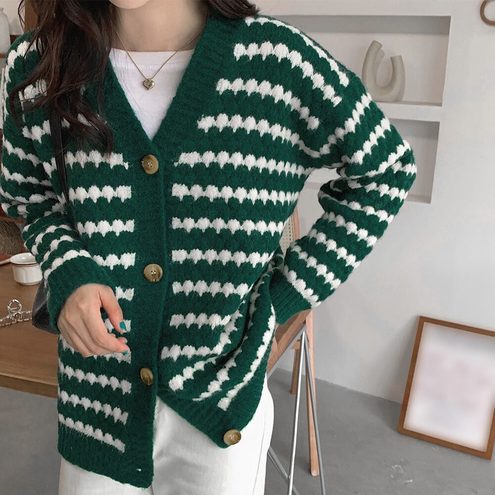 配色ボーダー柄ニットカーディガンVネック