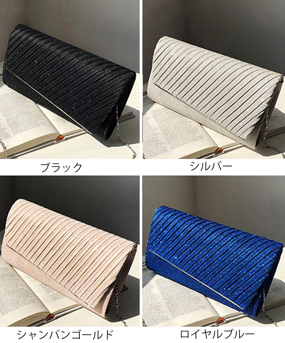 プリーツ加工をほどこしたサテン生地が上品なキラキラパーティーバッグ