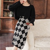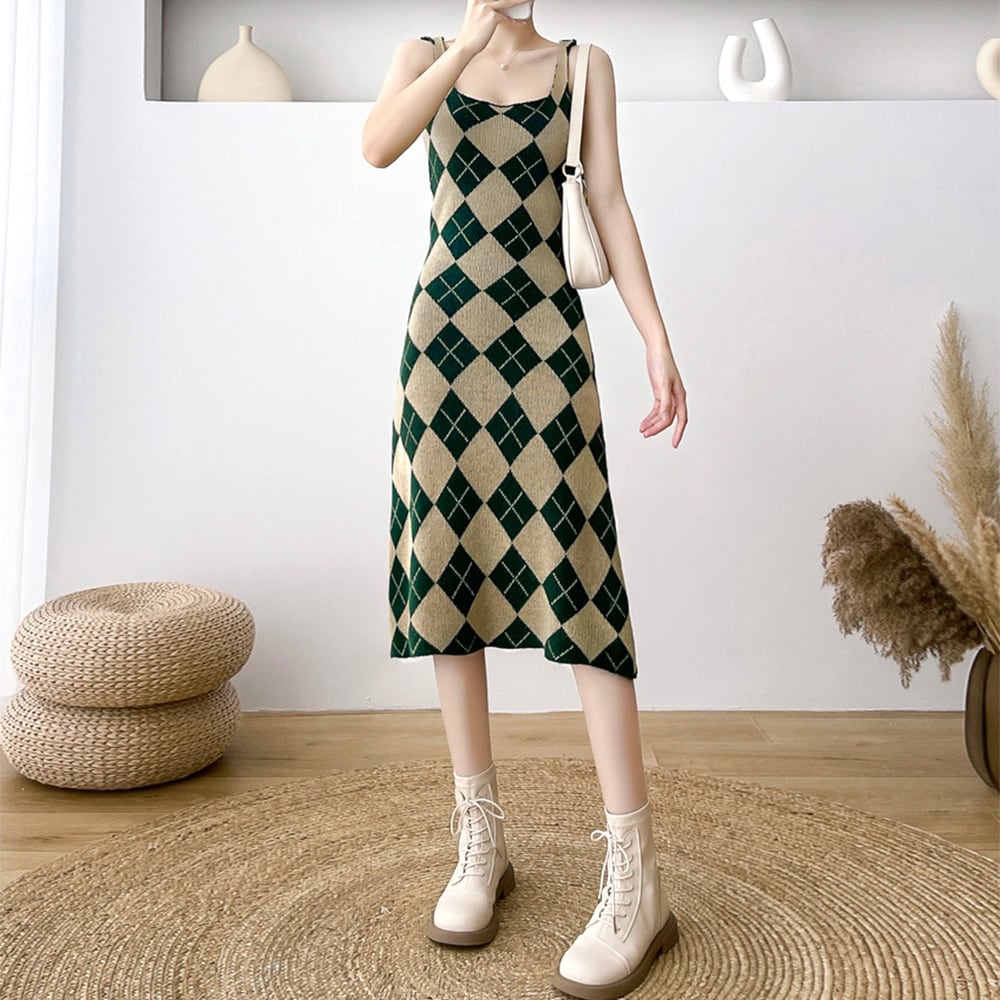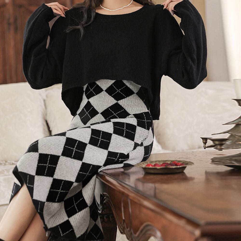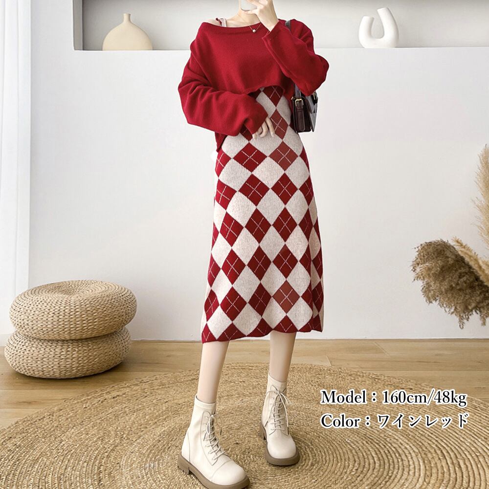 ショート丈 ニットトップス アーガイル柄 キャミワンピース フェミニン ツーピースセット 着やせニットワンピ 2点セット