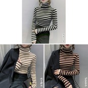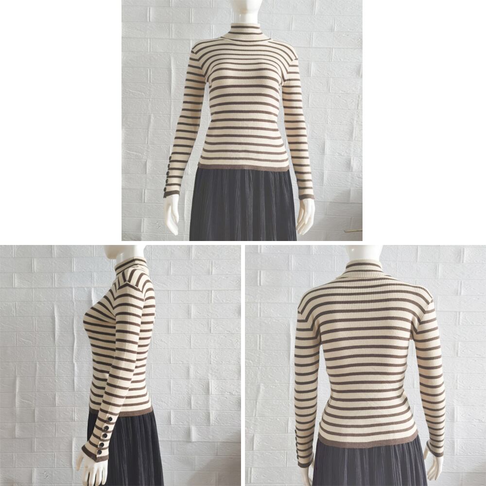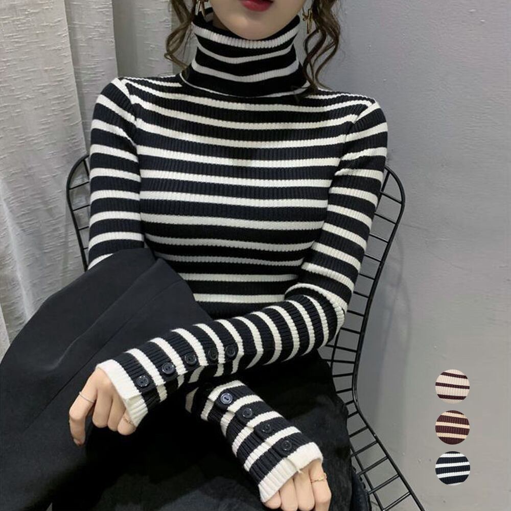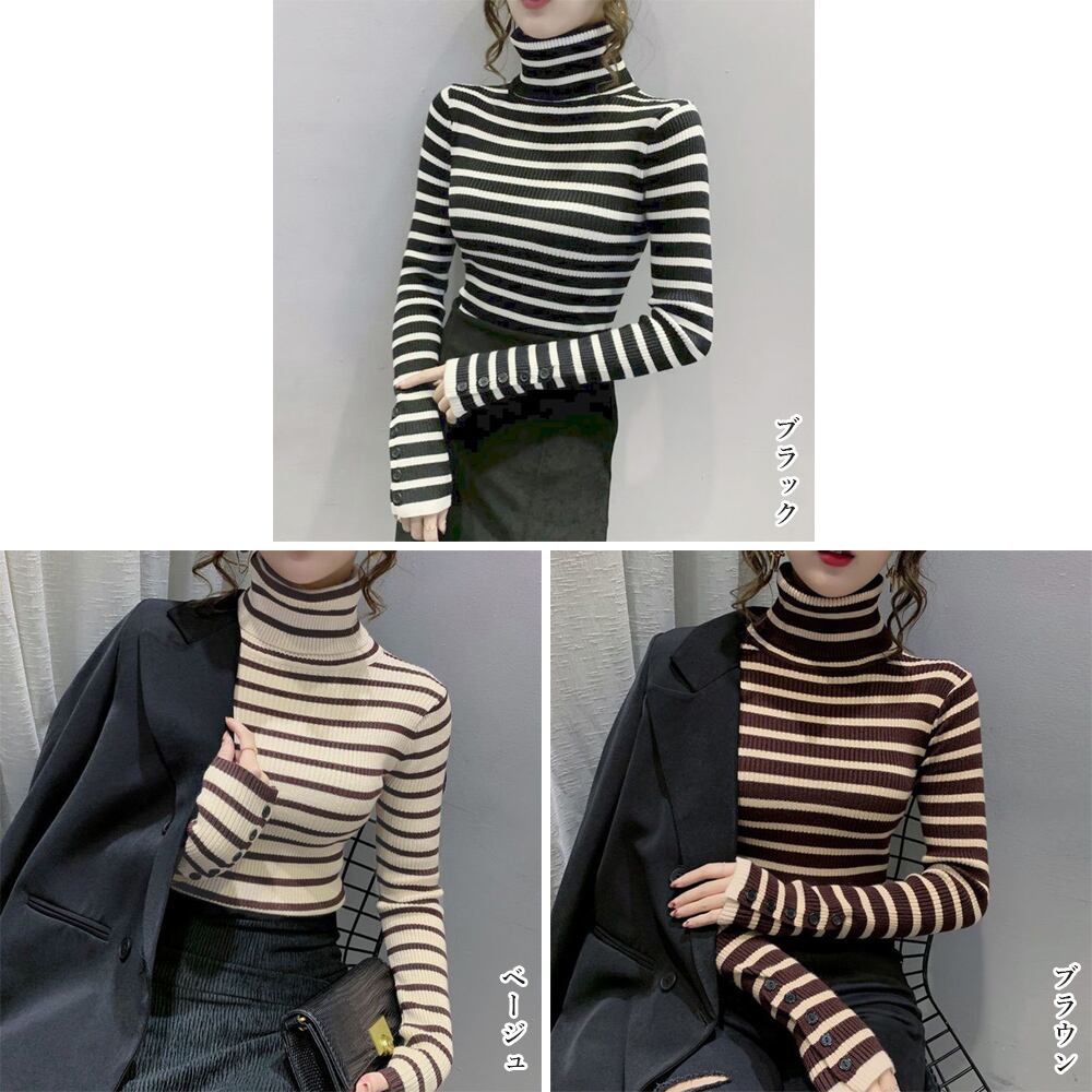 ボーダー柄ニットトップス タートルネック