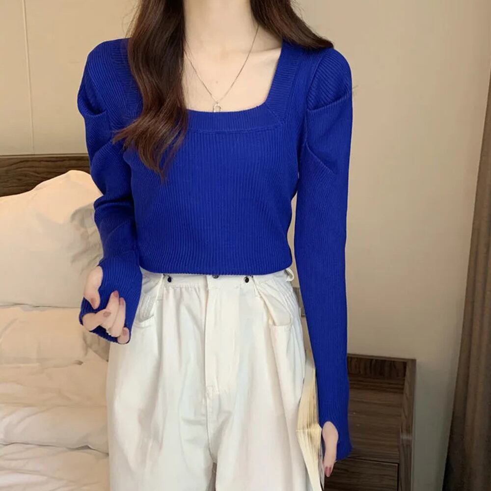 スクエアネック ニットウェア レディース カジュアル ニットプルオーバー パフスリーブ 普段着 ニットセーター 着やせ