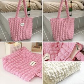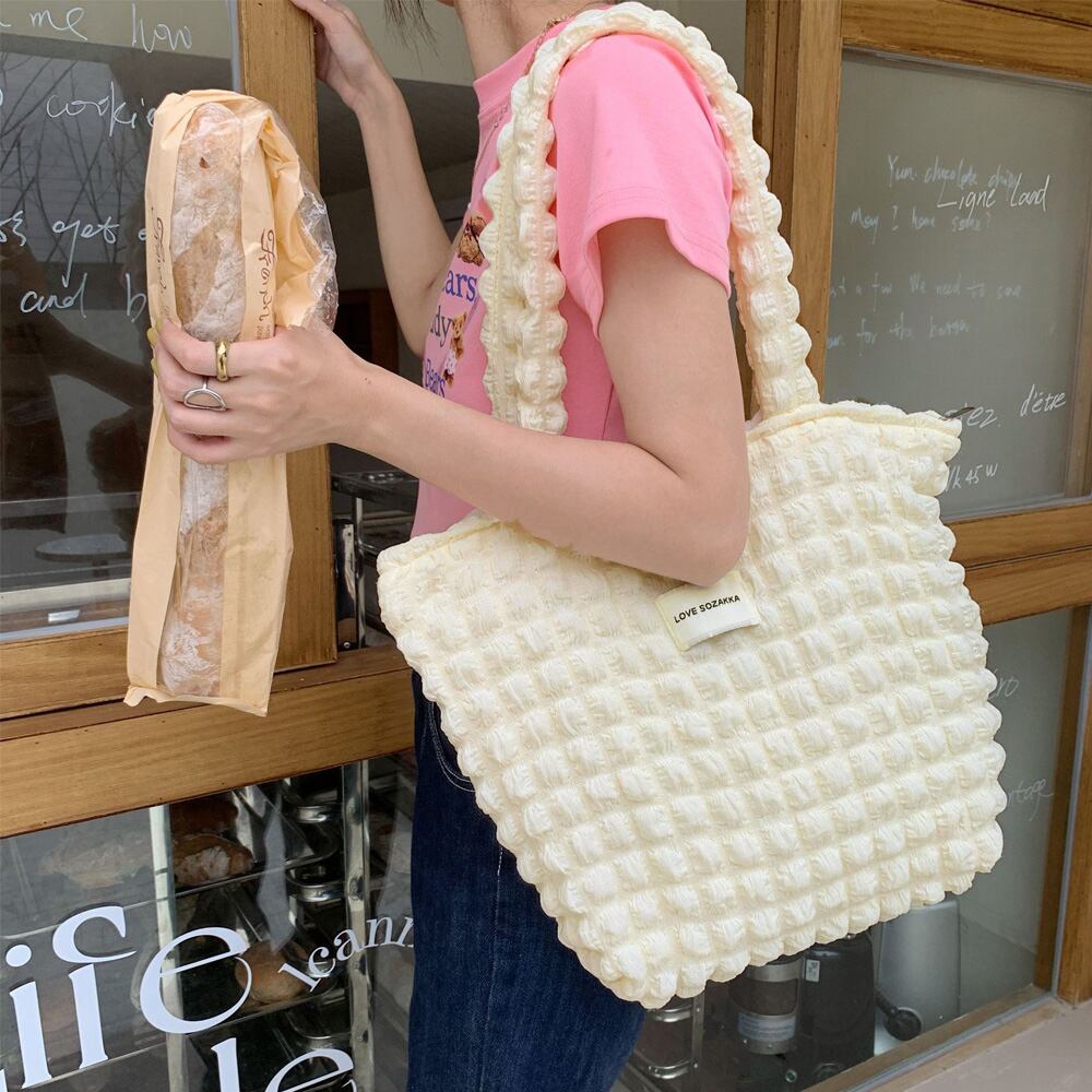 ぷくっと立体感のあるポップコーン生地がおしゃれ、持つだけでこなれ感のあるトートバッグ