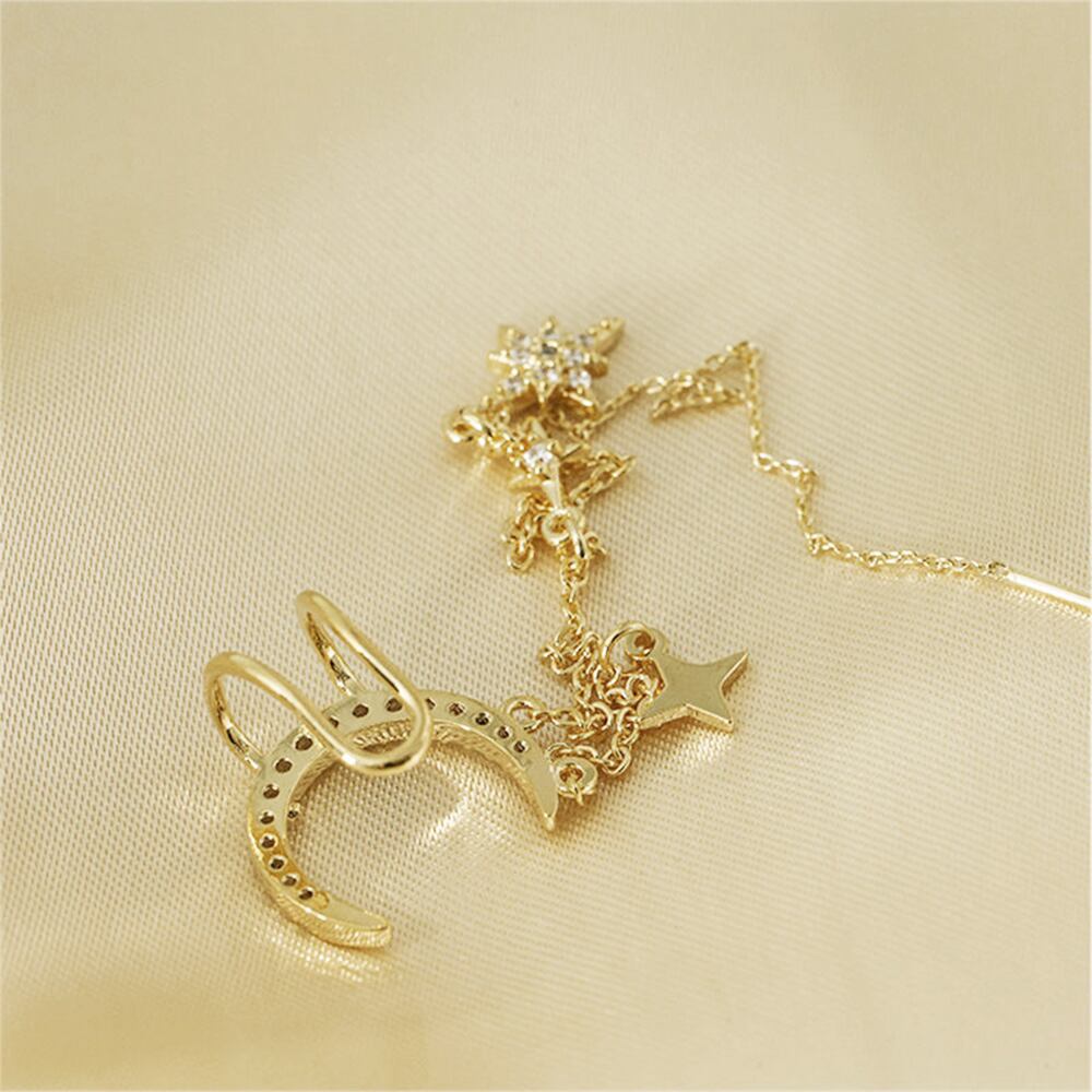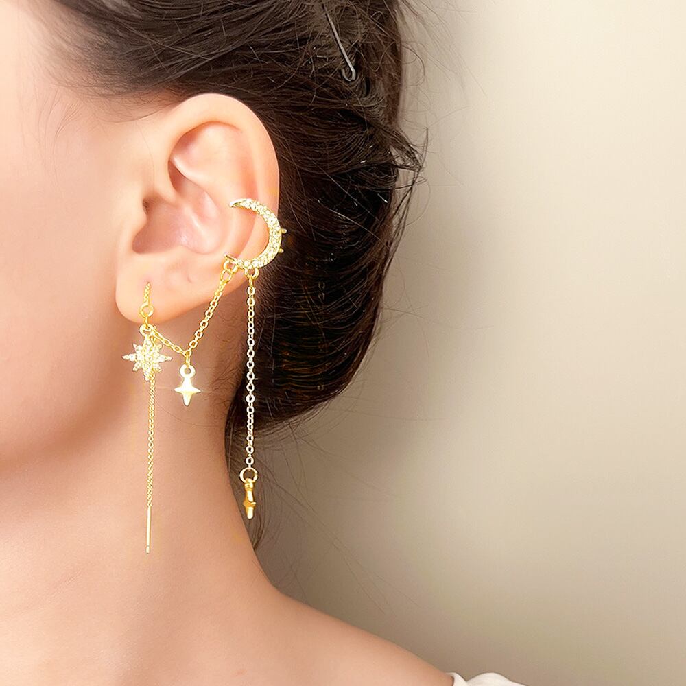 きらきら輝くラインストーンで飾られた三日月と星モチーフを組み合わせたイヤーカフ付きピアス
