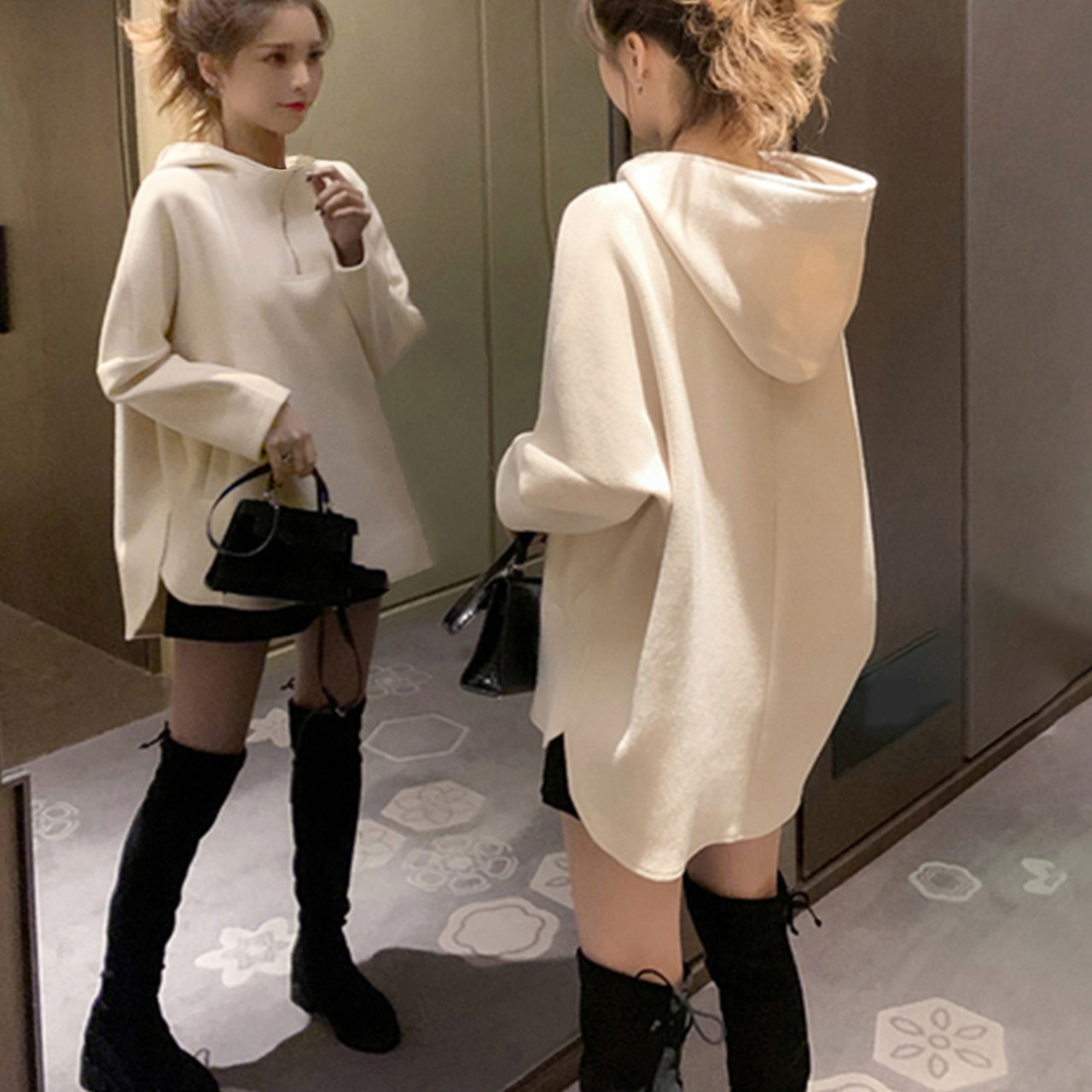 フーディースウェット レディース ドロップショルダー プルオーバー フード付きトップス 体型カバー ロングトレーナー春秋
