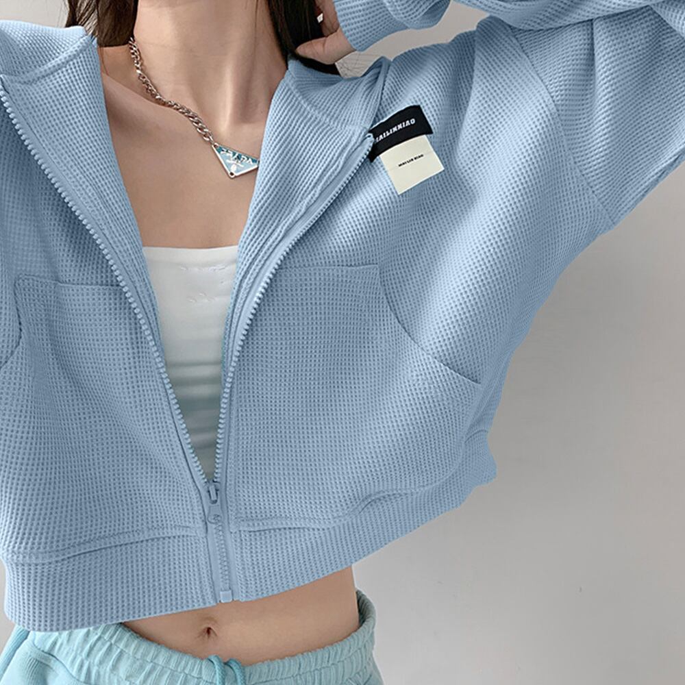 レディース ワッフル ショート丈 ZIPパーカー クロップド丈トップス フルジップフーディー ストリート ロゴスウェット