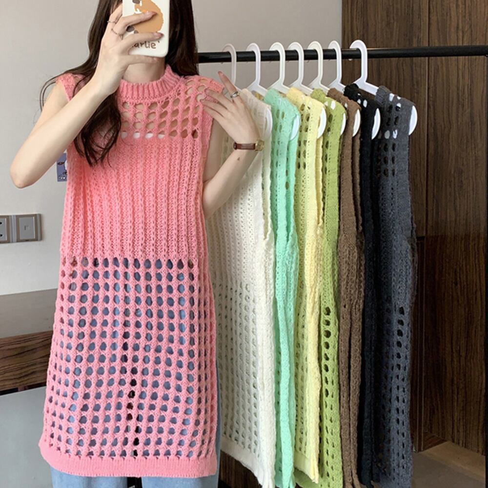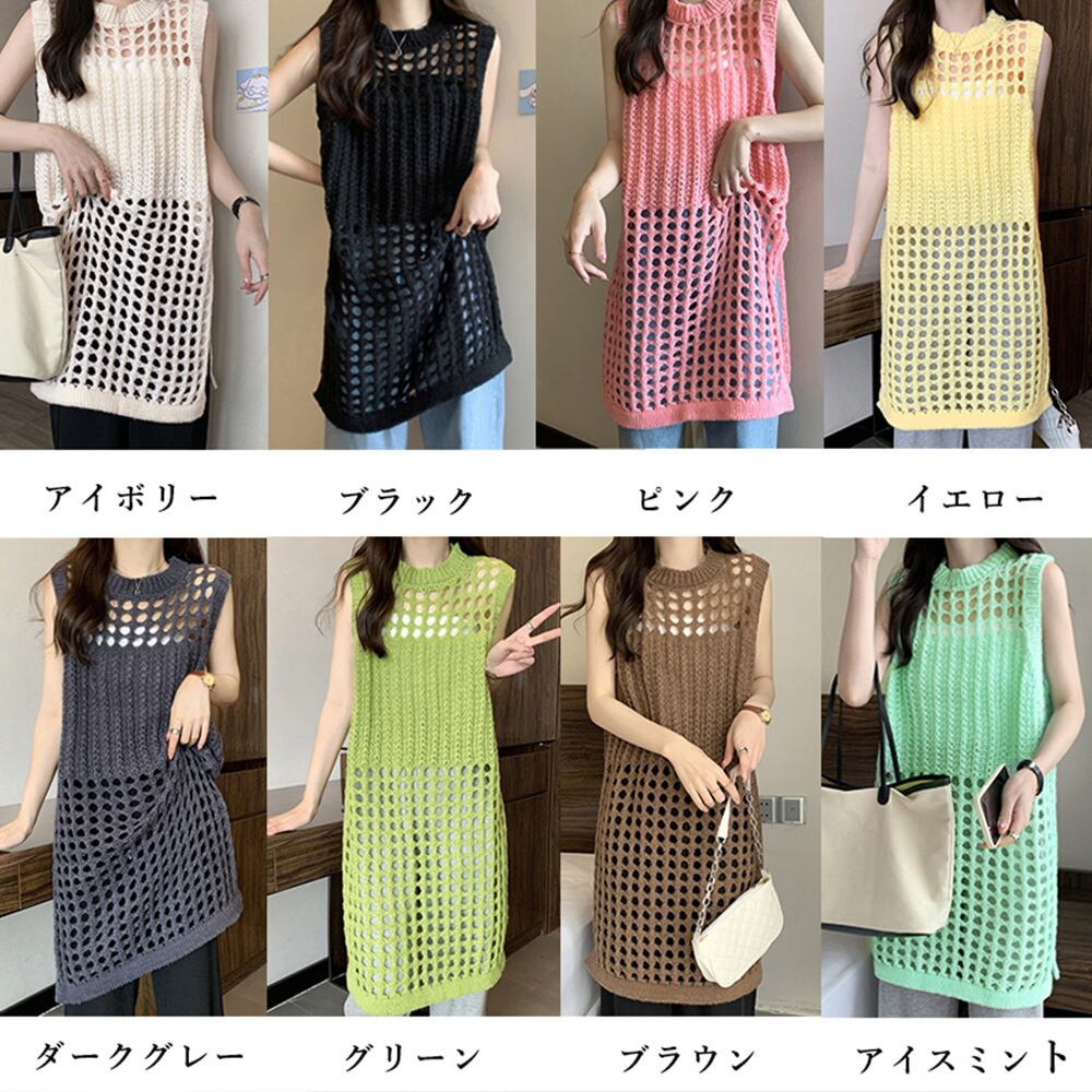チュニックニットベスト レディース ノースリーブニットトップス ゆったり 無地レイヤードワンピース 透かし編みベスト春夏