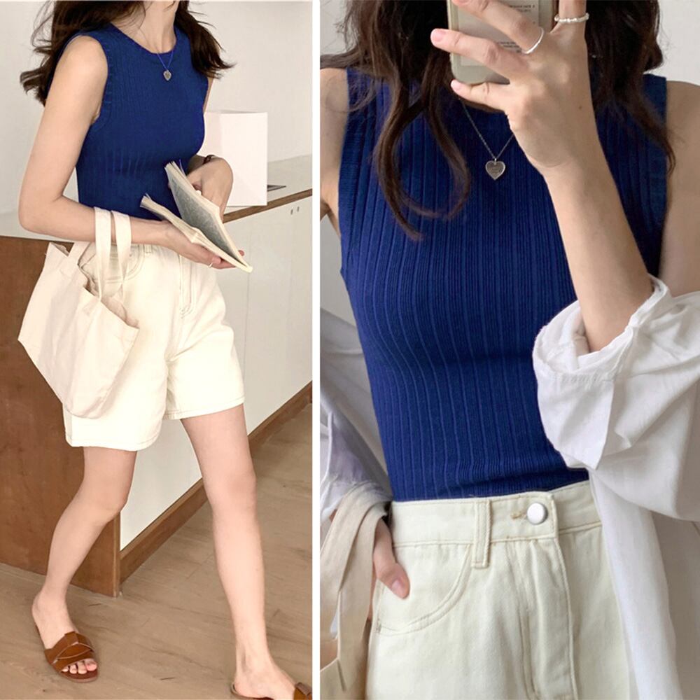 ラウンドネック  サマーニット 着回し 大人カジュアル 韓国 ノースリーブ ニットカットソー 無地お洒落 ニットインナー