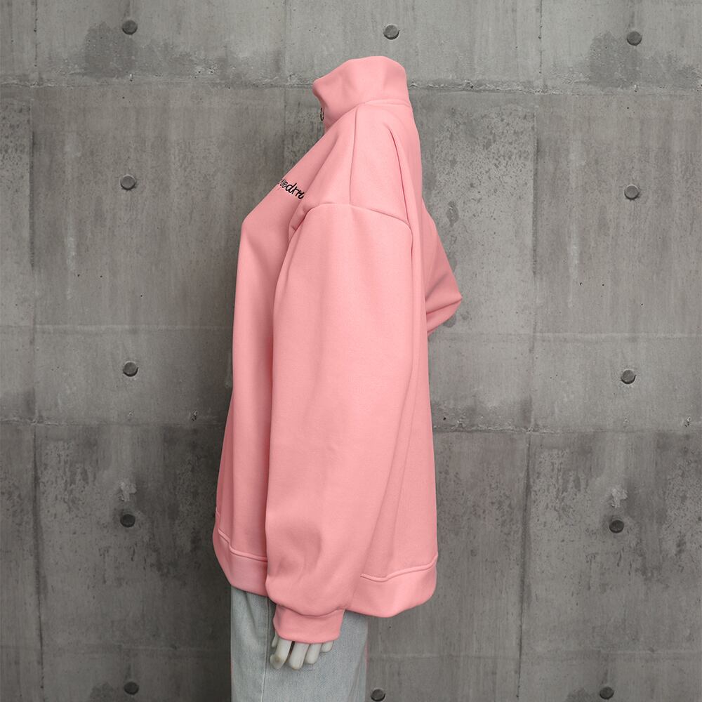 ワンポイントの英字ロゴがアクセント、首元のファスナーの開き感で表情が変わるのでバリエーション豊かに着まわせる