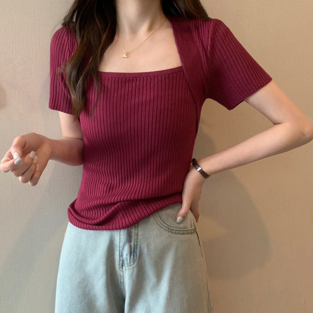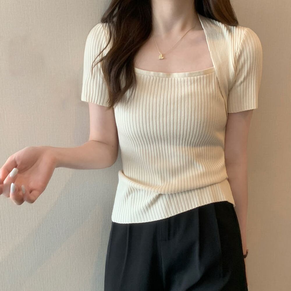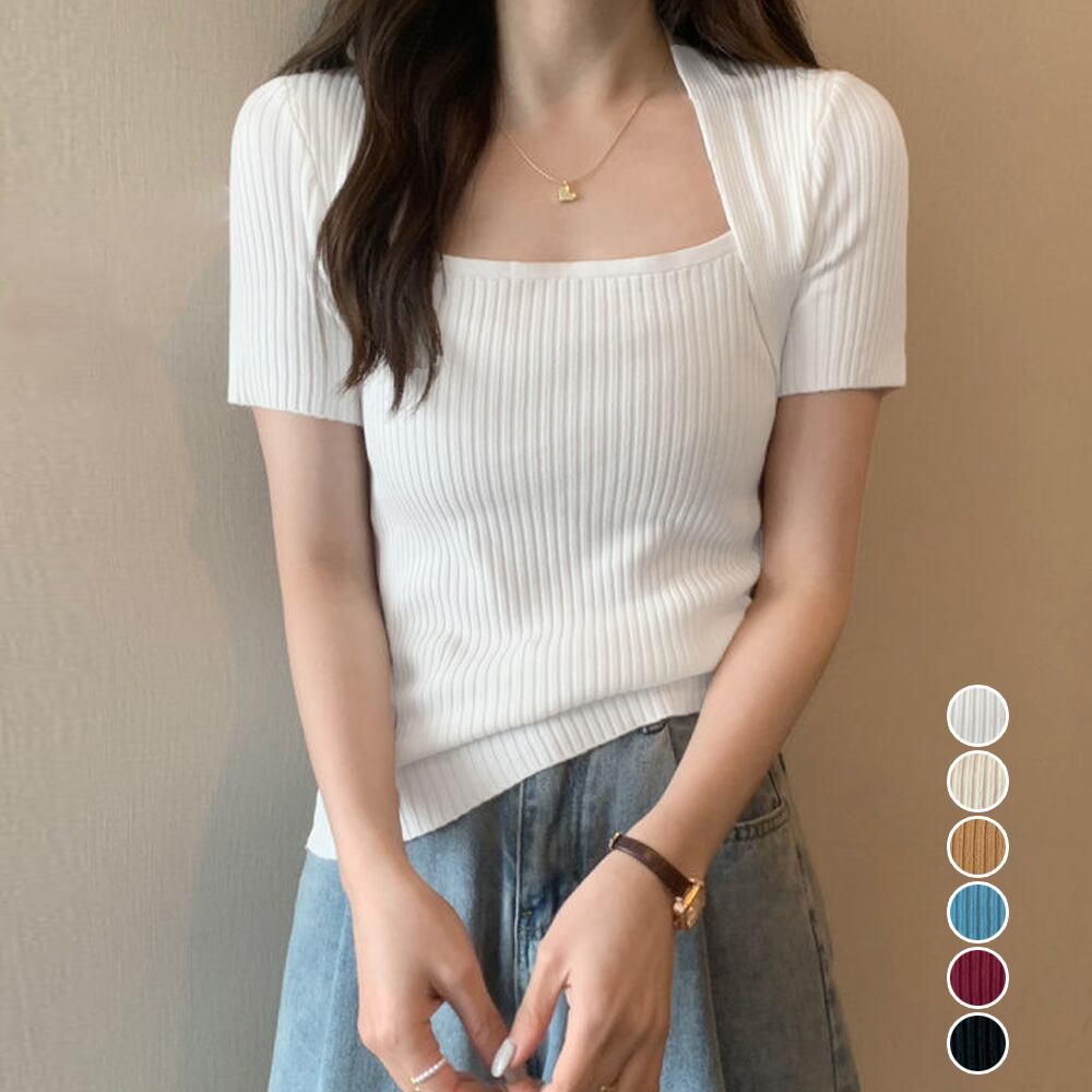 ニットトップス レディース カジュアル リブニットソー 半袖 シンプル プルオーバー 薄手ニットセーター おしゃれ 春夏