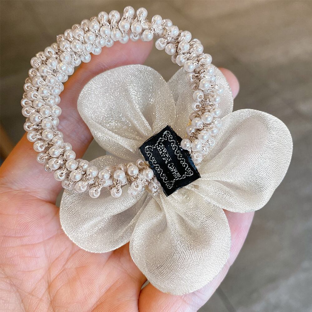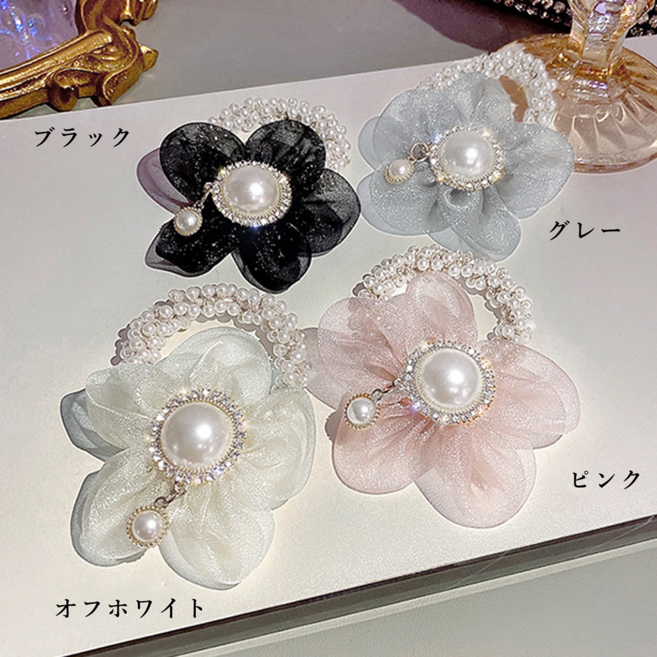 フェイクパールとフラワーモチーフが上品でおしゃれなシュシュ